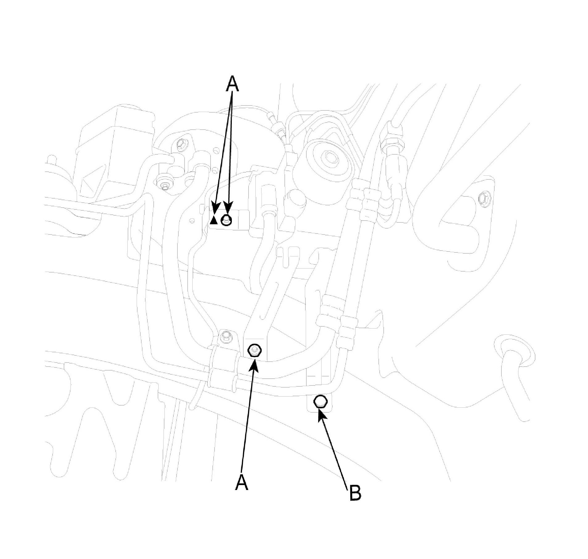 4. Loosen the 3 ABS HECU bracket bolts (A) and 1 nut (B), then remove HECU and bracket.