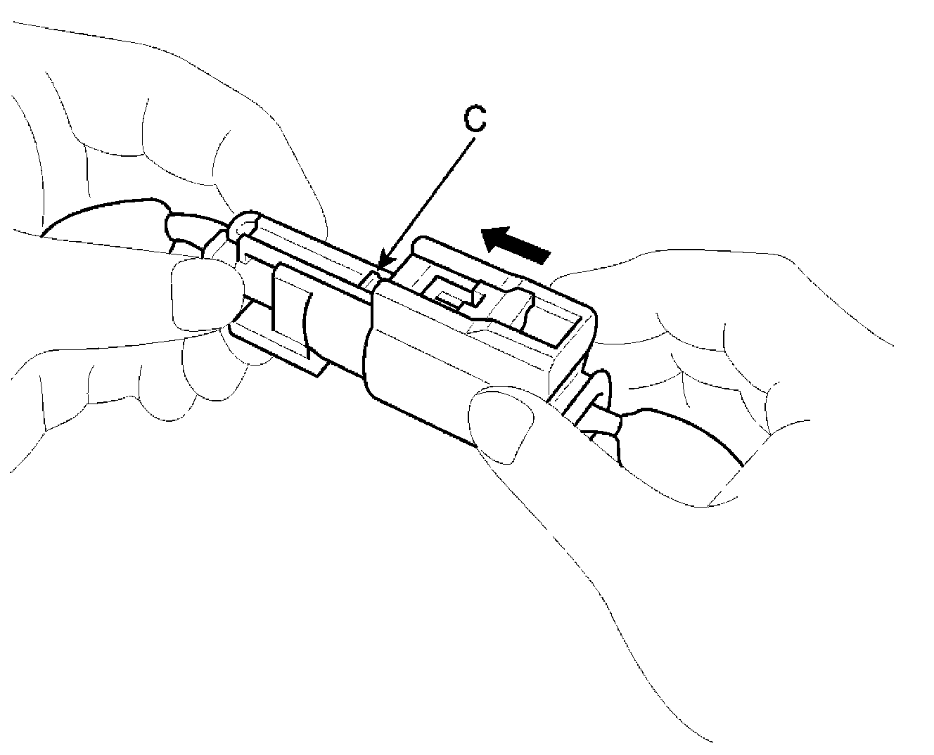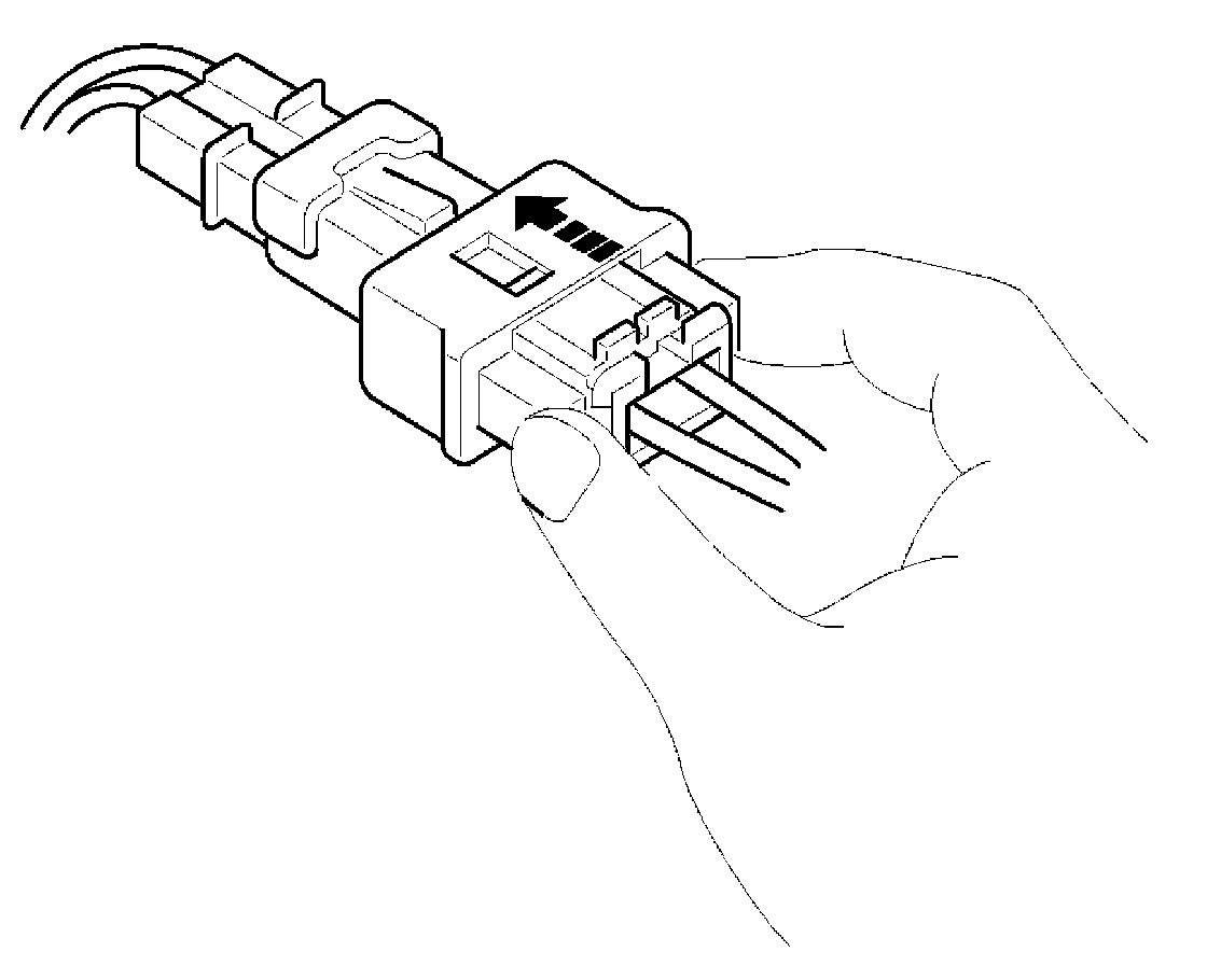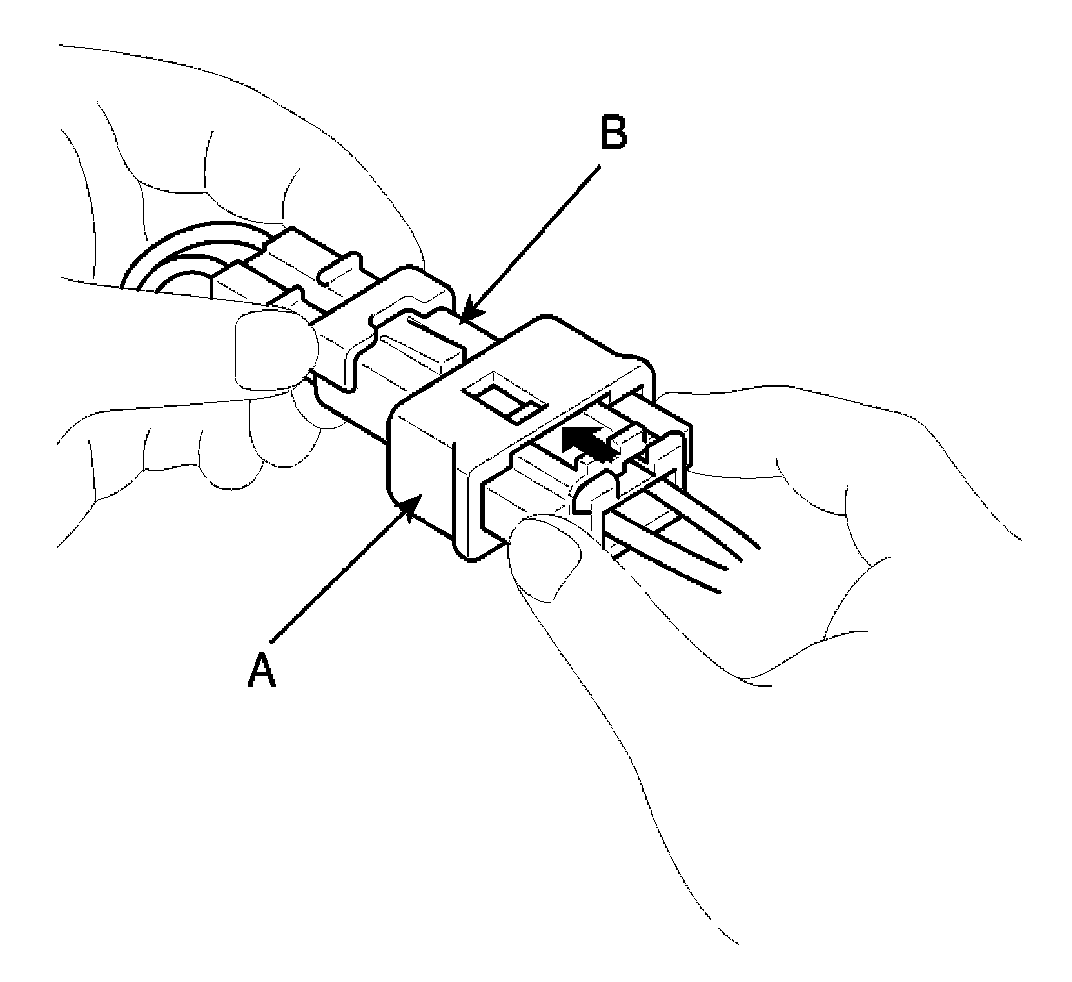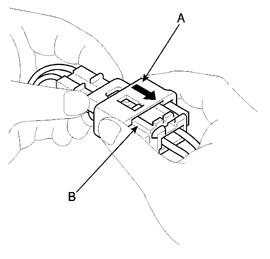 1. To reconnect, hold the pawl-side connector half, and press on the back of the sleeve-side connector half in the direction shown. As the two connector halves are pressed together, the sleeve (A) is pushed back by the pawl (C). Do not touch the sleeve.