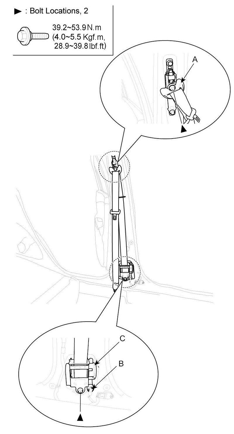 6. After disconnecting the pretensioner connector lock pin, remove the connector (B), Loosen the mounting bolt, then remove the pretensioner (C).