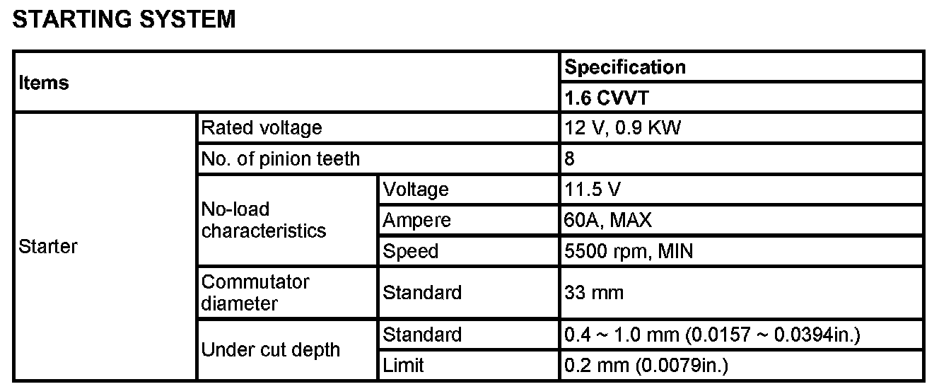Starting System - Specification: