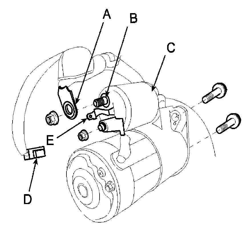 4. Disconnect the starter cable (A) from the B terminal (B) on the solenoid (C), then disconnect the connector (D) from the S terminal (E).