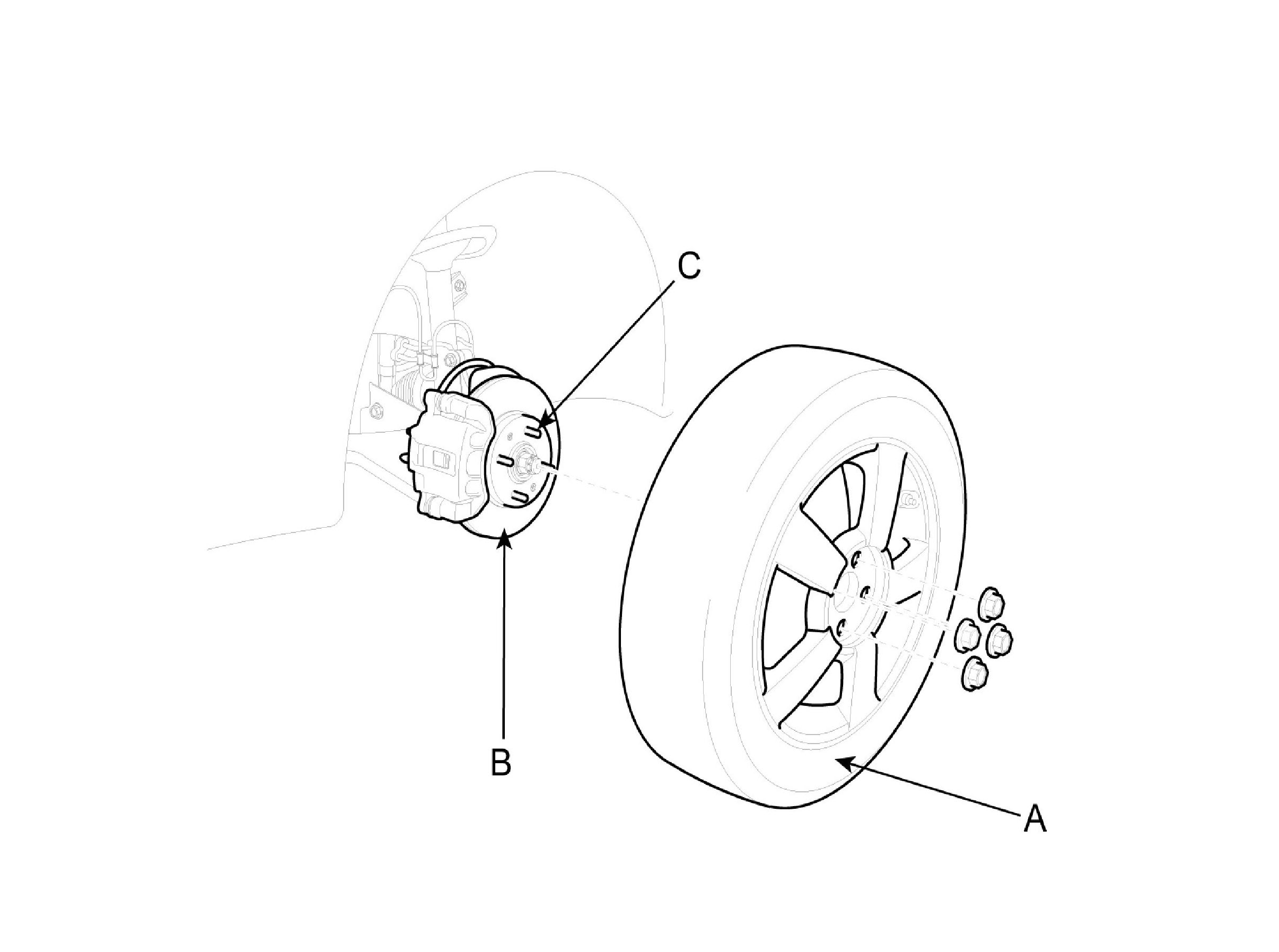 CAUTION: Be careful not to damage the hub bolts (C) then remove the front wheel and tire (A).