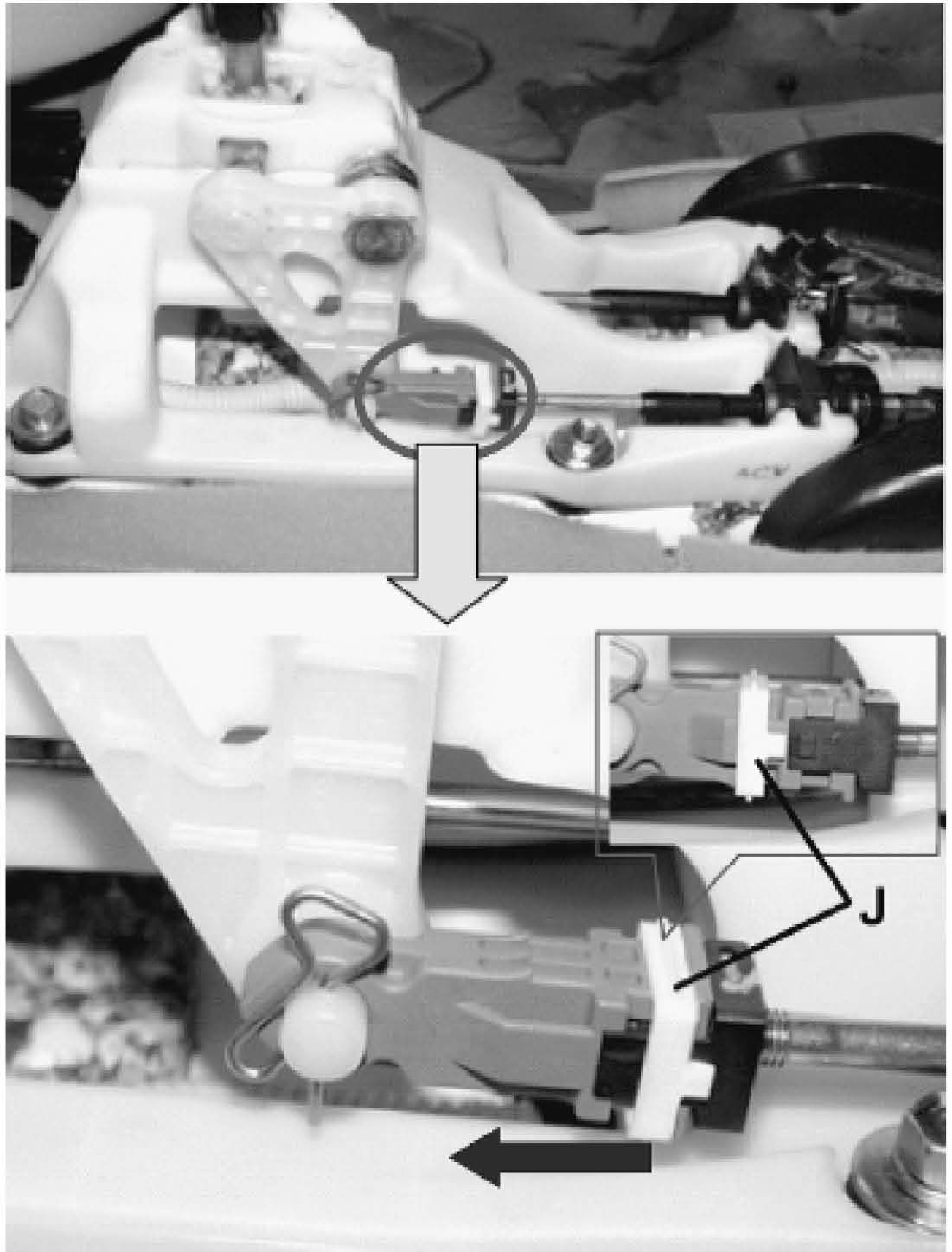 8. Move the white cover of cable adjuster (J) rearward.