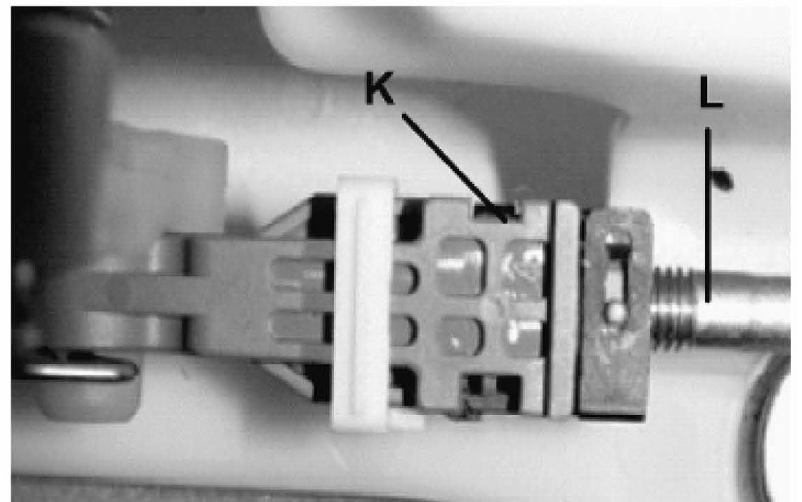 9. Push the locking tab (K) in the arrow direction by using a flat blade screwdriver to release the shift cable (L).