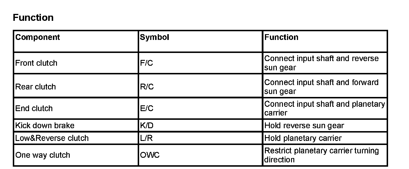 5. After the engine has been started and the vehicle is in motion, the transaxle control module continues to refine its performance for smoothest possible gear shifting. The hydraulic control system consists of an oil pump that generates hydraulic pressure for A/T. It also has valves and solenoid valves that control the hydraulic pressure or switch the oil passage. The valves and solenoid valves are all built into the valve body. For better and smoother shift quality, the rear clutch pressure is controlled independently, 4th->2nd gear skip shift is available and the line pressure at 3rd/4th gear is reduced. There are 6 solenoid valves are incorporated on the valve body. 2 of those are duty-controlled type and the rest are ON/OFF type.