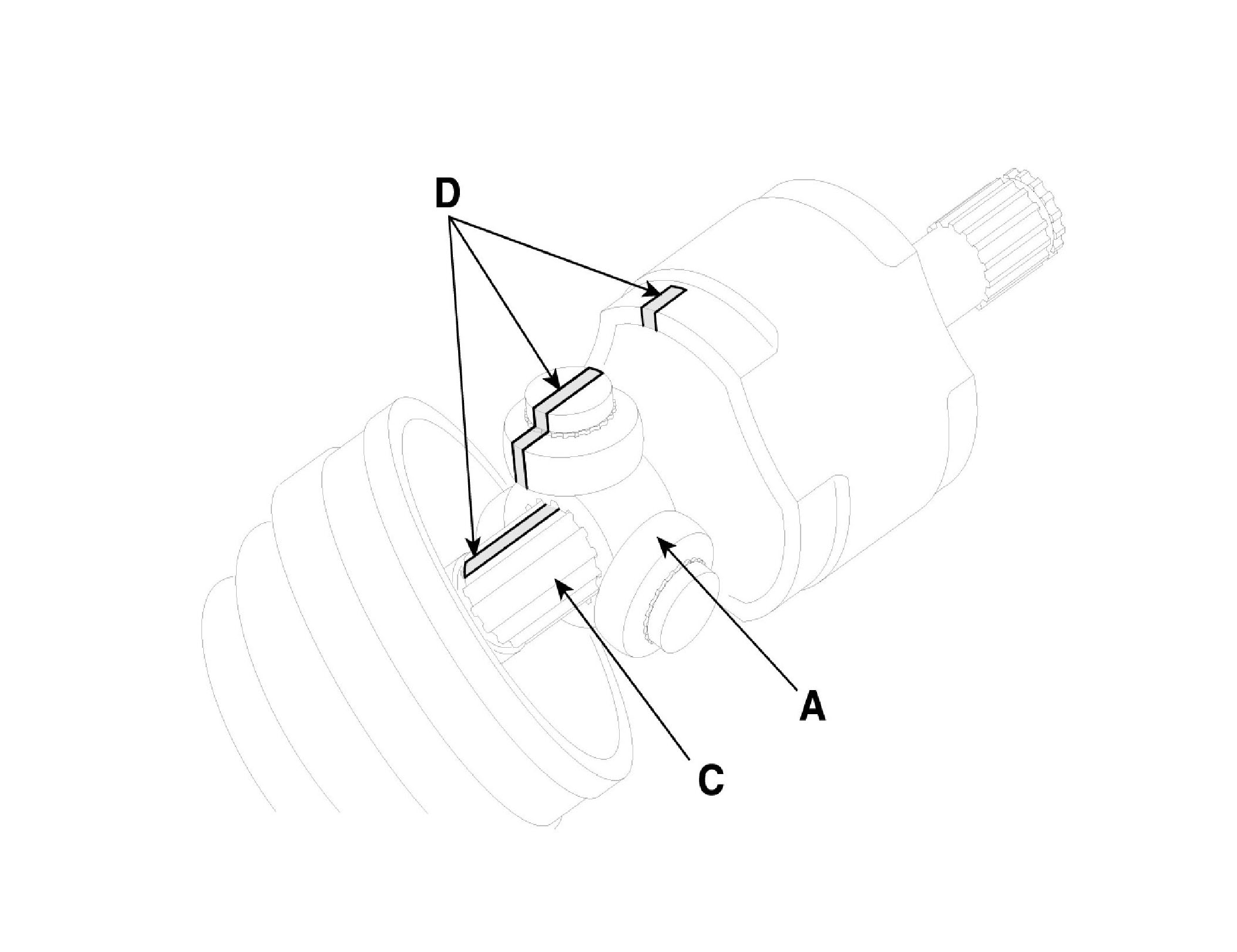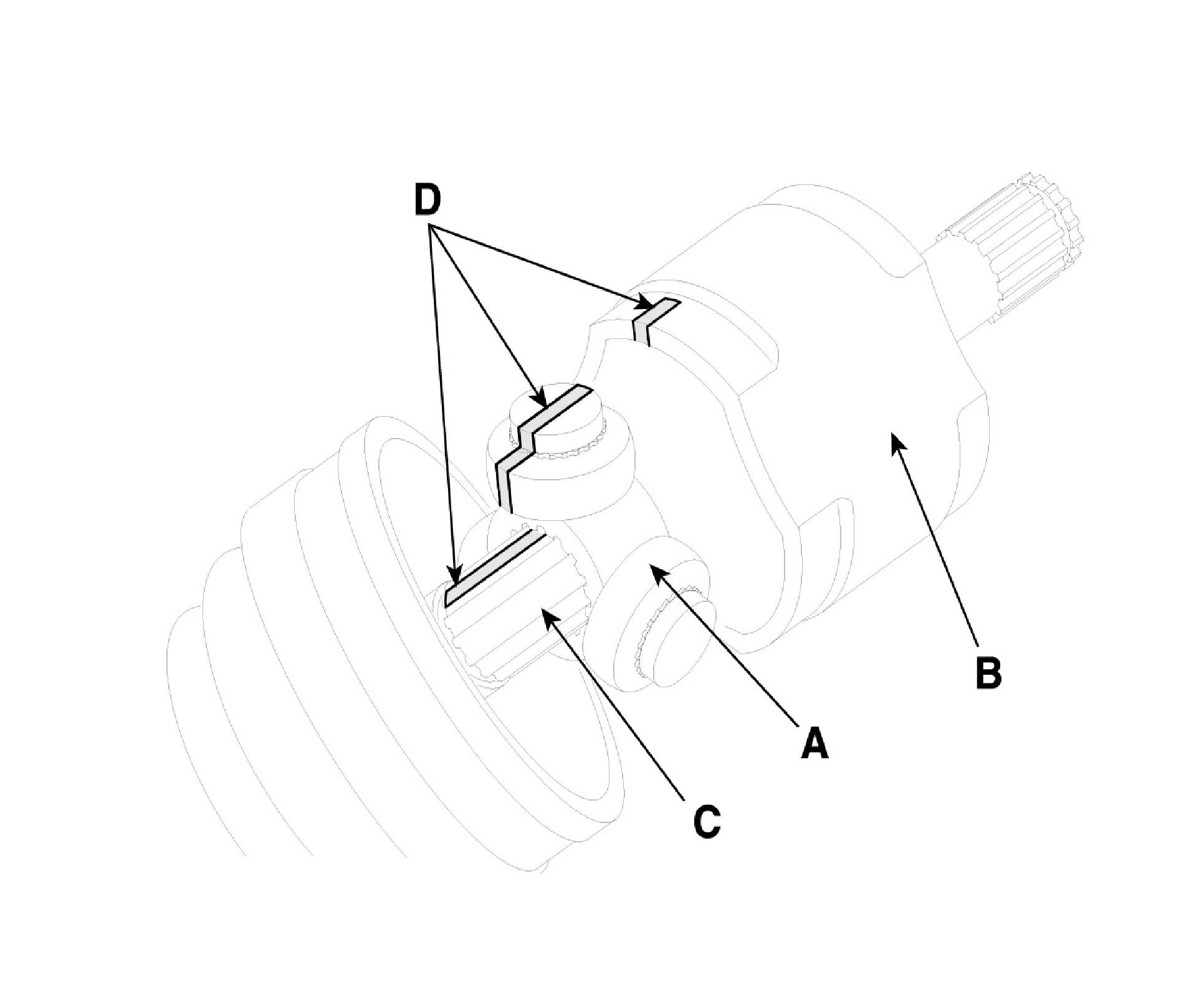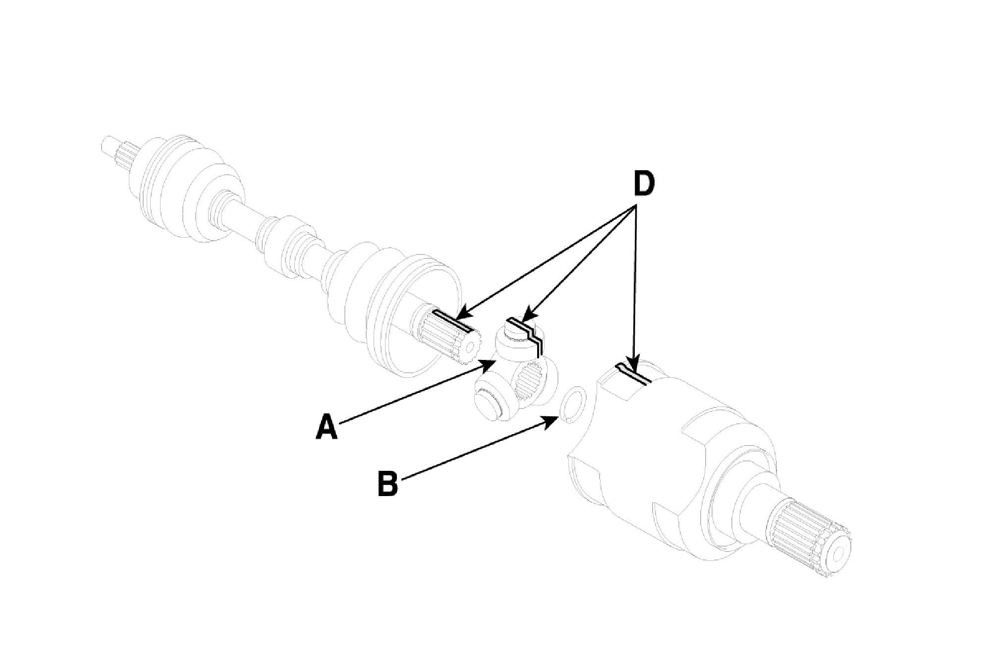 ^ According to illustration below, put across spider assembly (A), UTJ case (B), and shaft splines (C) to aid in reassembly.