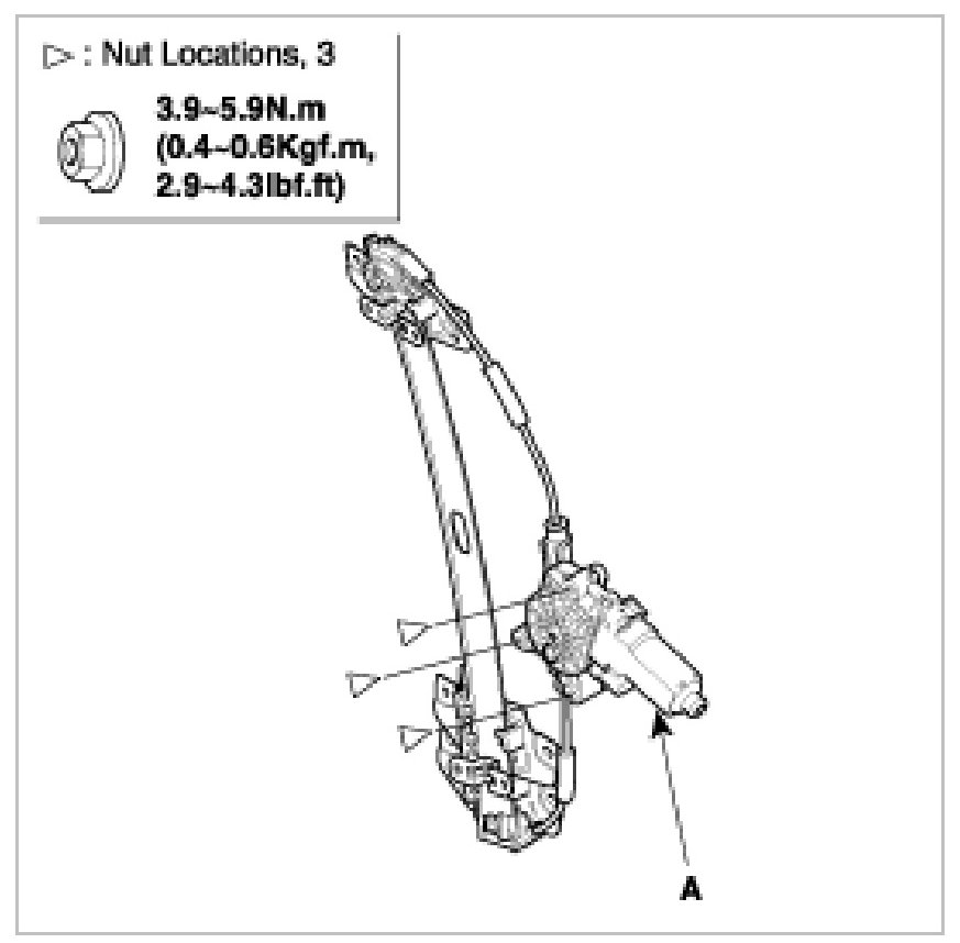 2. After loosening the power window motor mounting nuts, remove the power window motor (A).