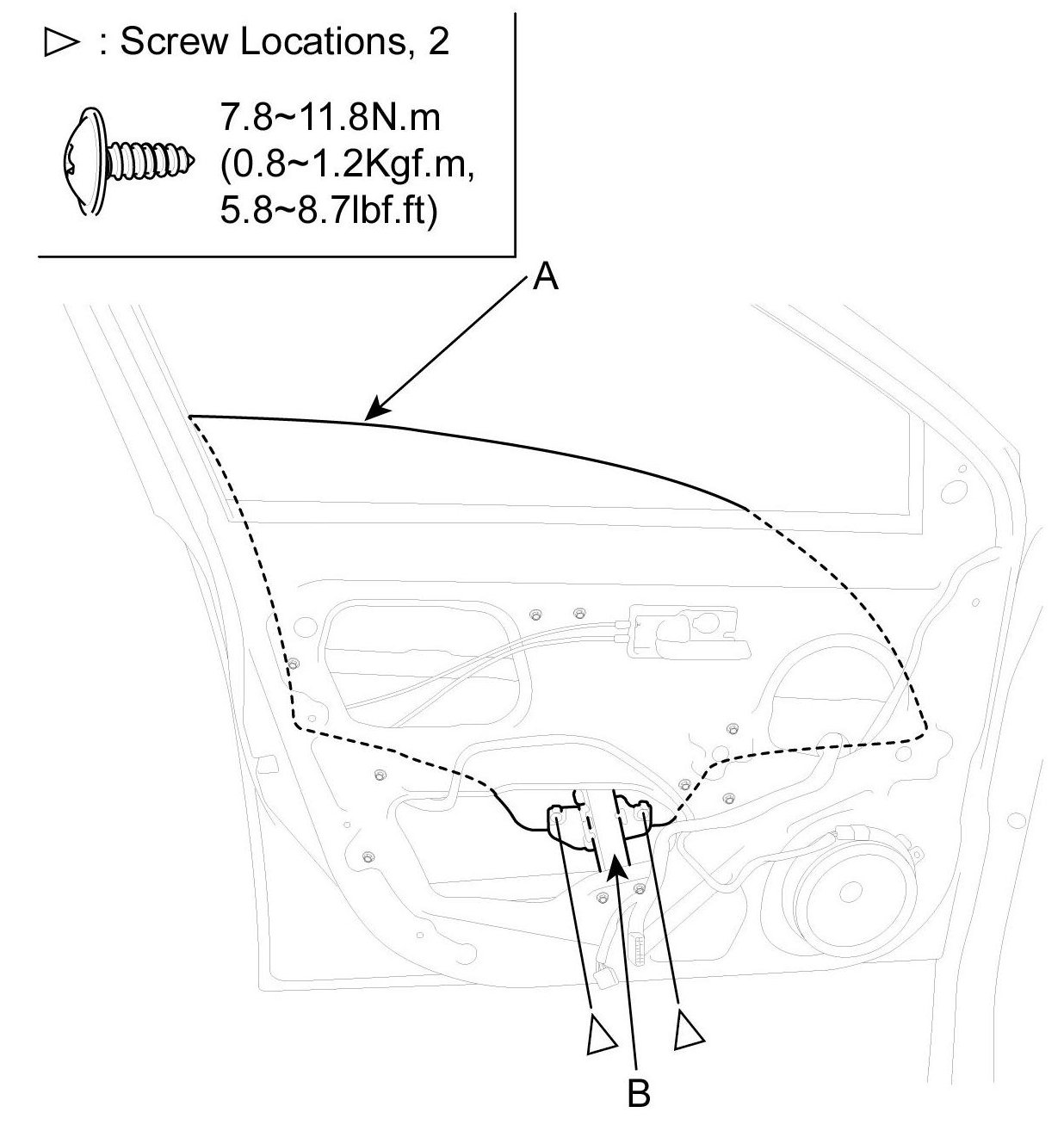 3. Carefully move the glass (A) until you can see the bolts, then loosen them. Separate the glass from the glass run and carefully pull the glass out through the window slot (B).