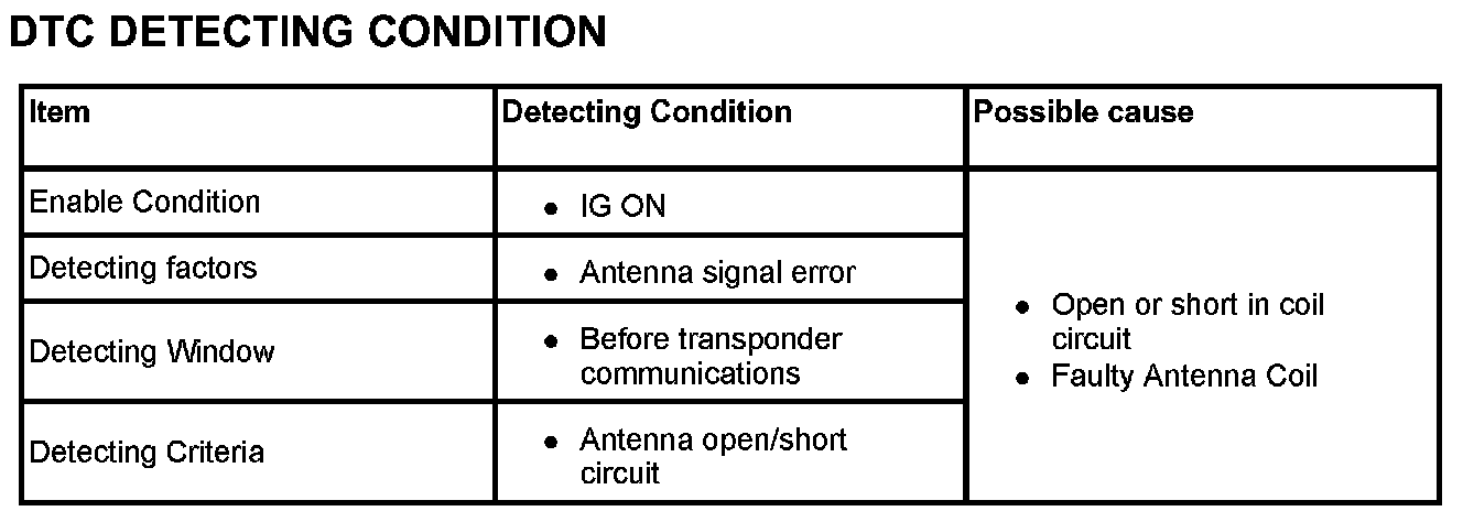 This DTC indicates that there is open or short in antenna coil circuit.