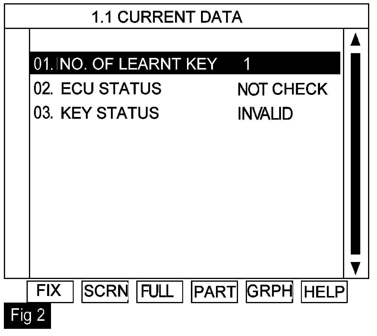 1. Connect scan tool and monitor CURRENT DATA to check No. of Learnt key, PCM and KEY status.