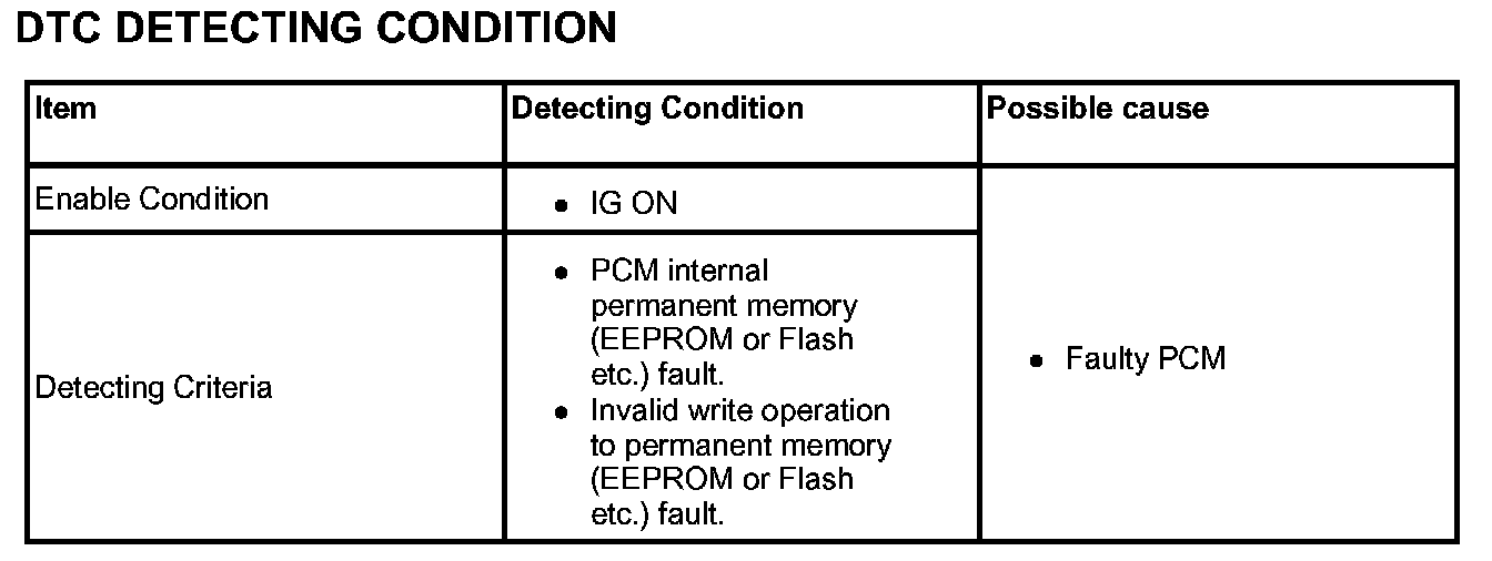 This DTC is indicates that not only PCM have inconsistent data of EEPROM for number of keys taught, user password state and invalid write operation to EEPROM but PCM can not recognize the unique PIN code during Key Authentication.