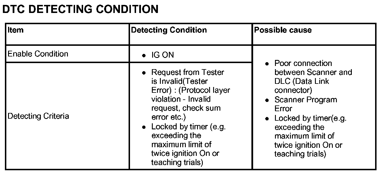 This DTC indicates that PCM received invalid tester message / unexpected requests from tester or PCM Locked by timer (e.g. exceeding the maximum limit of twice ignition On or teaching trials).