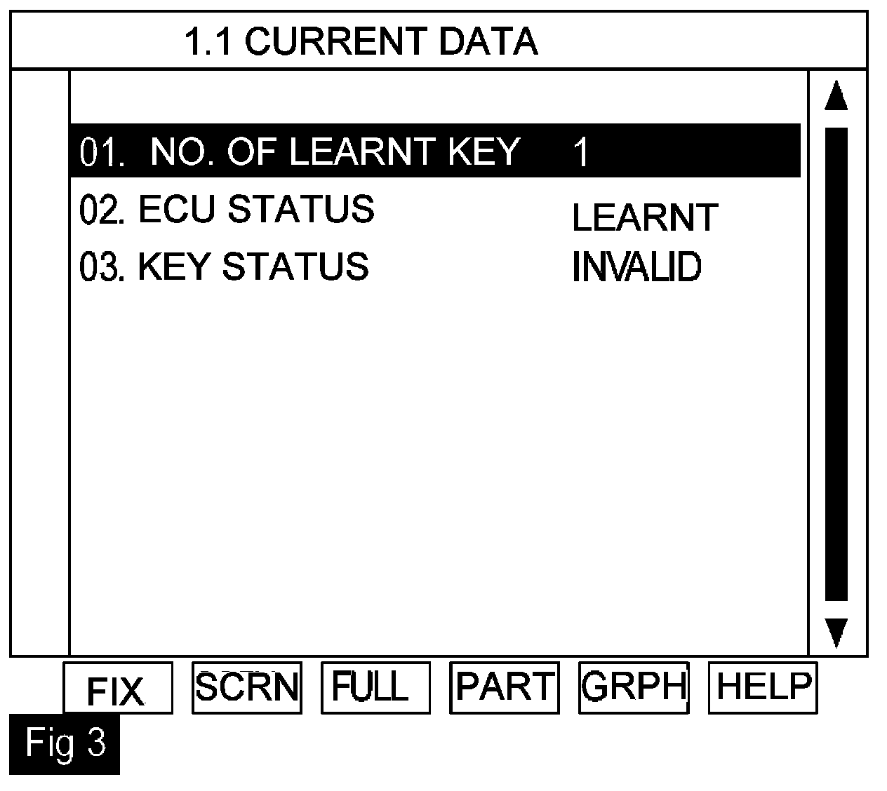 1. Connect scan tool and monitor CURRENT DATA to check No. of Learnt key, PCM and KEY status.