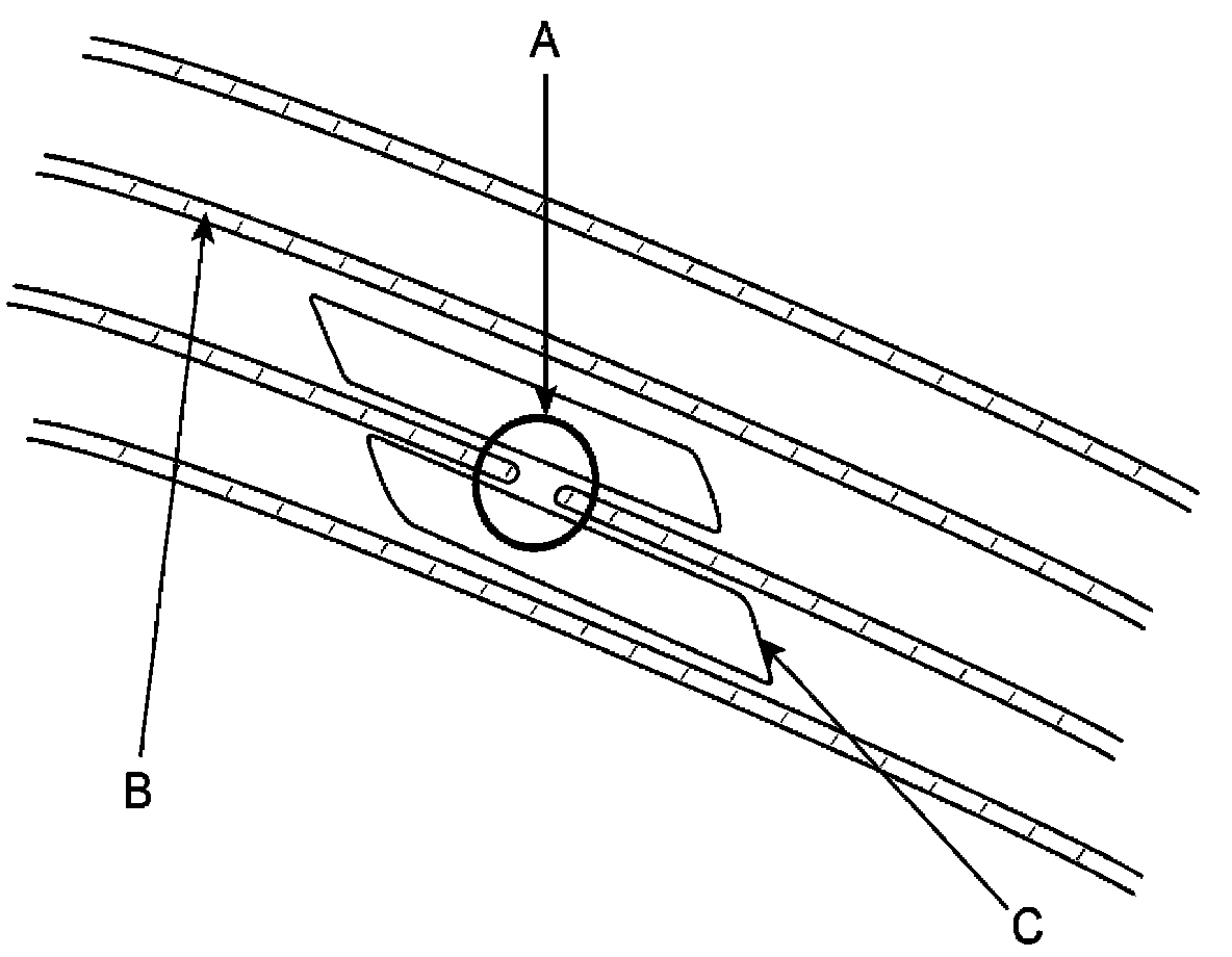 2. Carefully mask above and below the broken portion of the glass antenna wire (B) with cellophane tape (C).