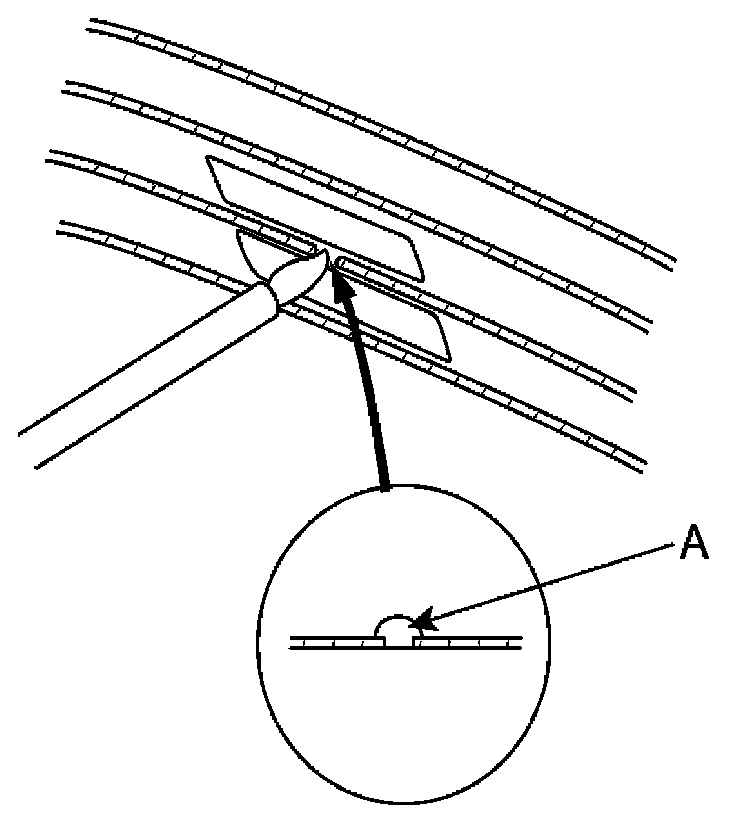 3. Using a small brush, apply a heavy coat of silver conductive paint (A) extending about 1/83" on both sides of the break. Allow 30 minutes to dry.