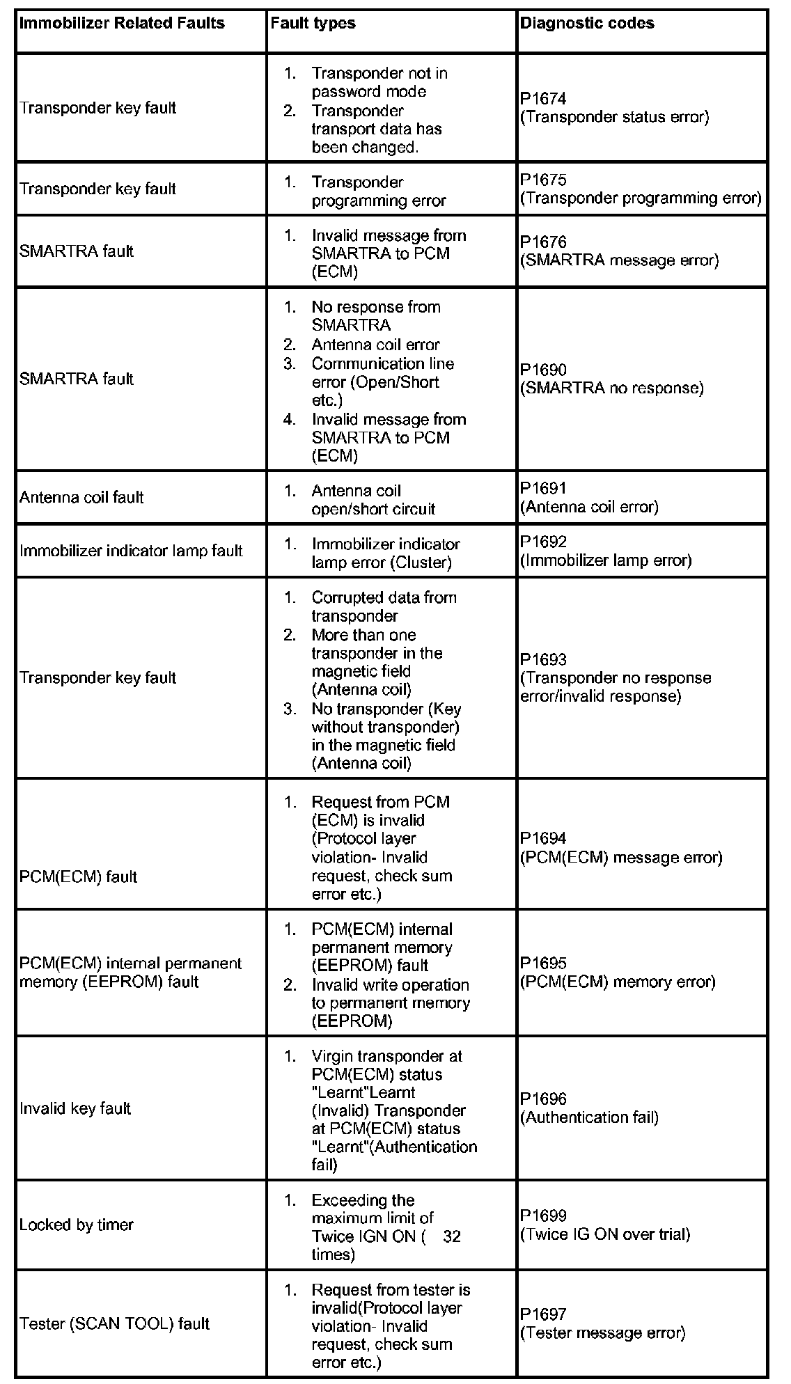 The table shows the assignment of immobilizer related faults to each type: