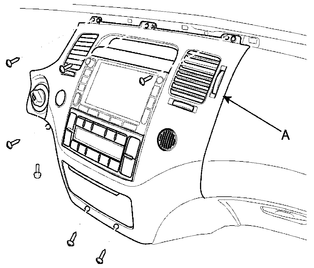 3. Remove the center facia panel (A) after loosening the screws. Avoid damaging retaining clips.