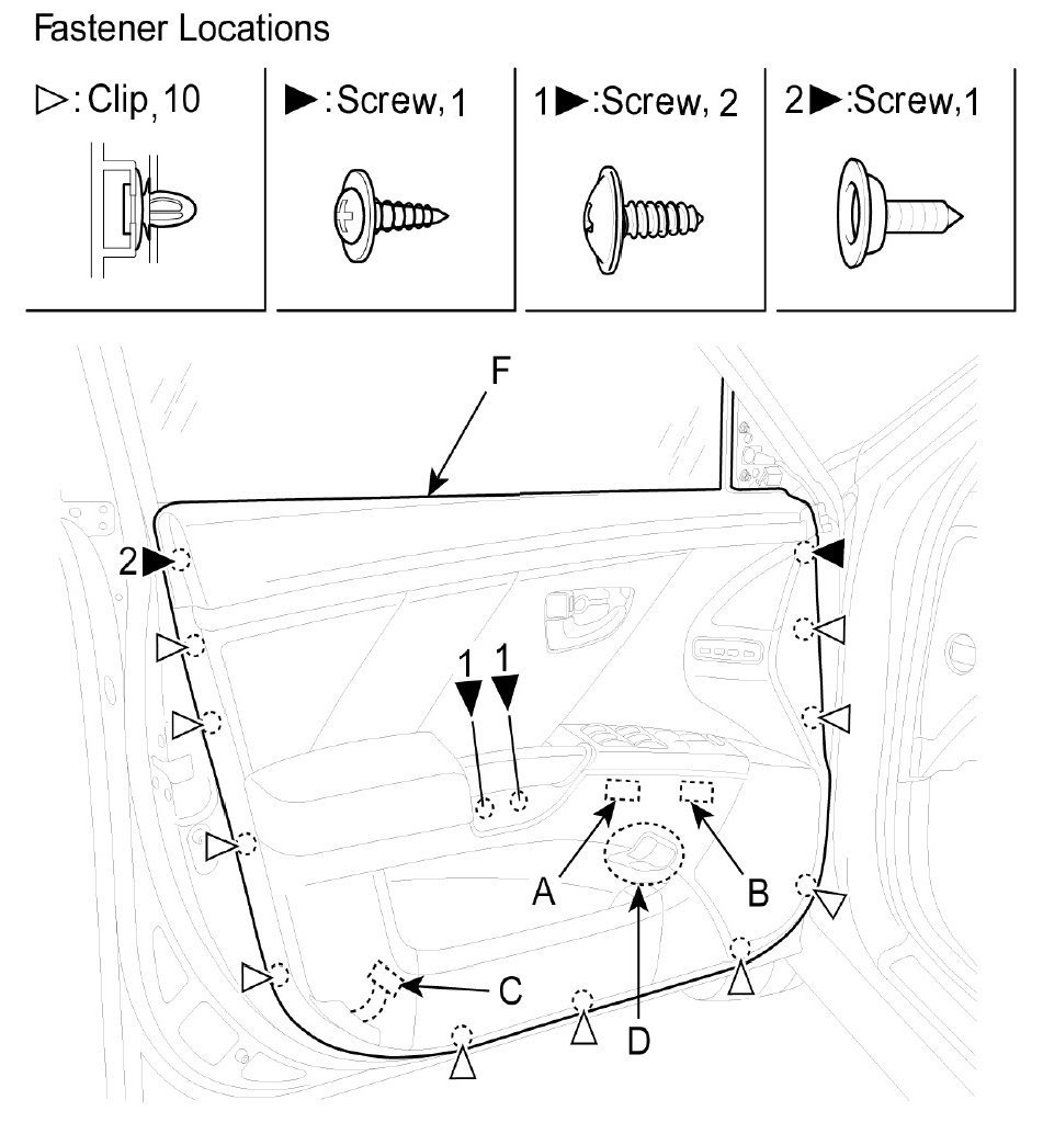 3. Loosen the door trim (F) mounting screws. Release the clips that hold the door trim, then remove the door trim by pulling it upward. Disconnect the power window switch connector (A), power mirror connector (B), and door courtesy lamp connector (C), trunk lid connector (D).