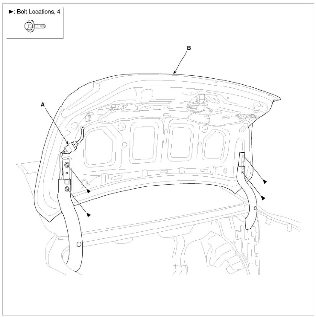 2. Loosen the bolts, then remove the trunk lid (B).