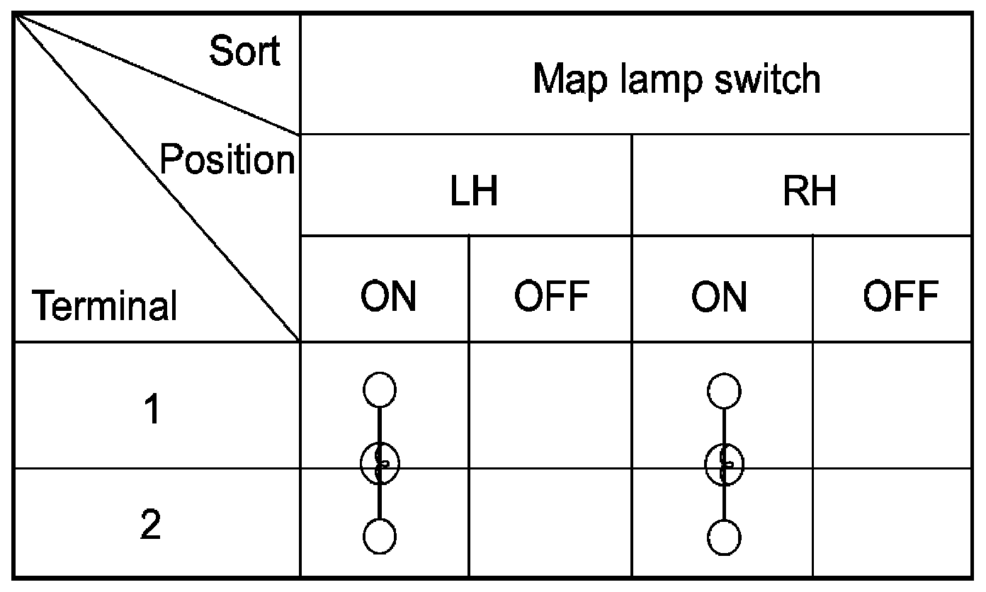 Remove the overhead console lamp assembly then check for continuity between terminals. If the continuity is not as specified, replace the map lamp switch.