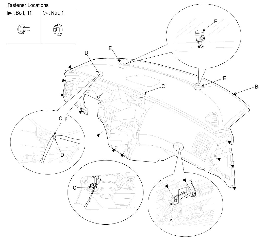 - Before tightening the bolts, make sure the crash pad wire harnesses are not pinched.