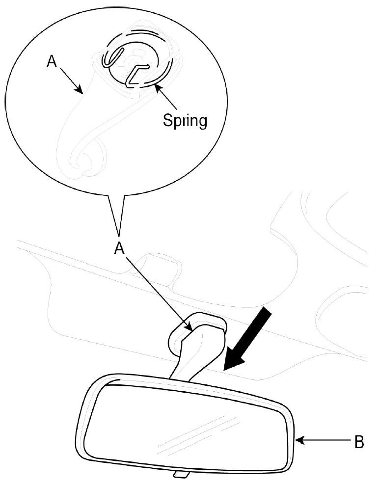 Push the inside rear view mirror base (A) down to remove to inside rear view mirror assembly (B).
