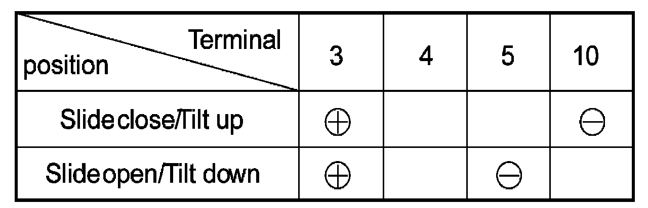 3. Ground the terminals as shown in the table, and check that the sunroof unit operates as shown in the table.