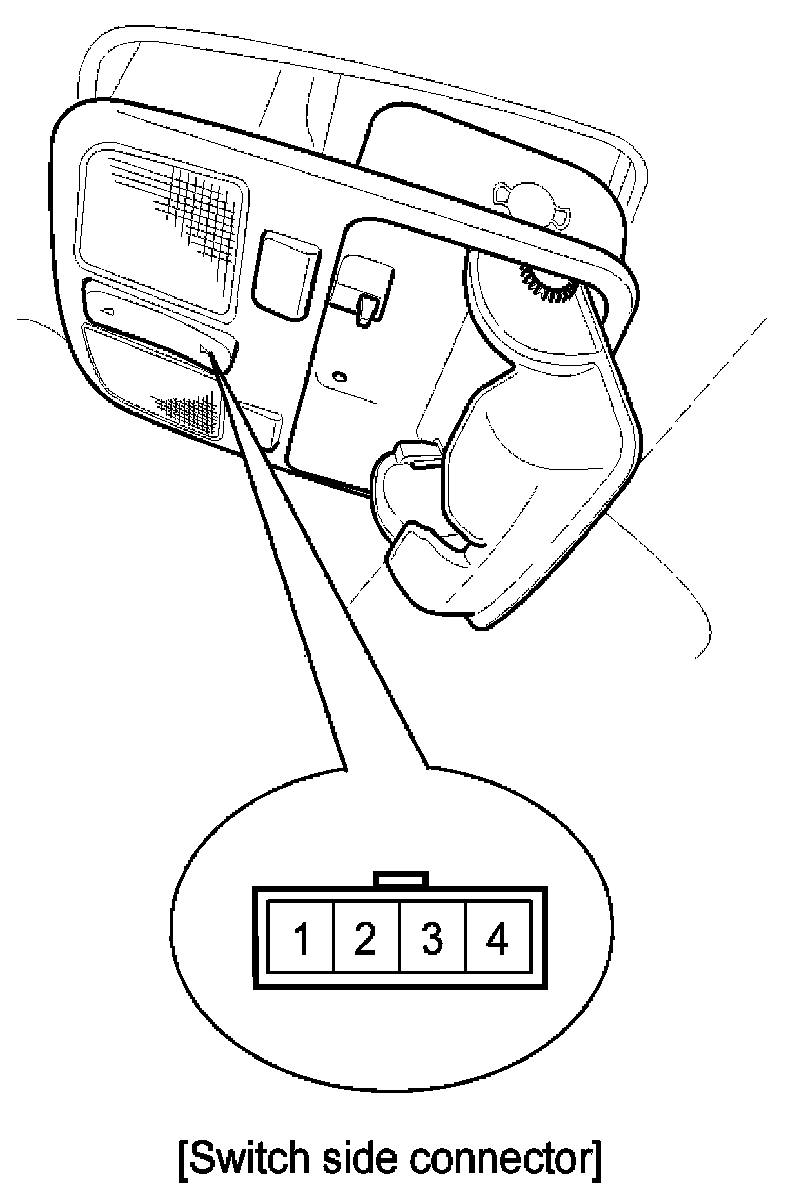 3. Disconnect the connector then remove the overhead console lamp assembly from the headliner. Check for continuity between the terminals. If the continuity is not as specified, replace the sunroof switch.