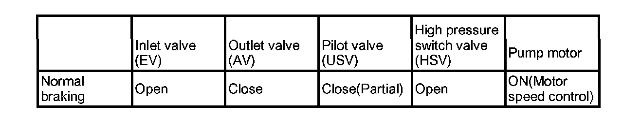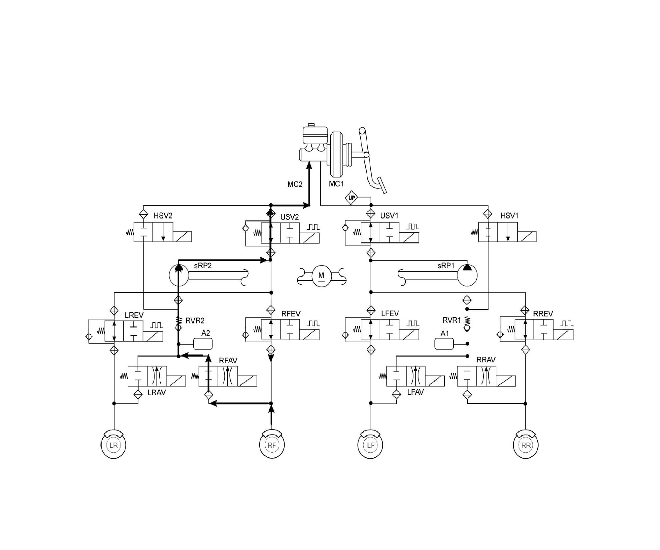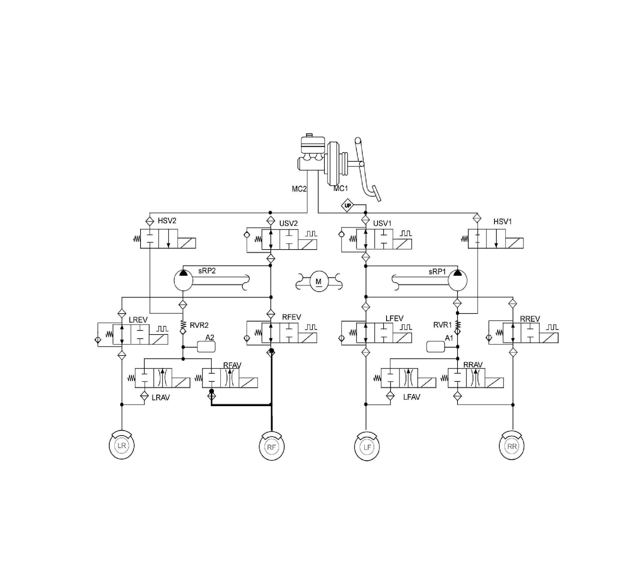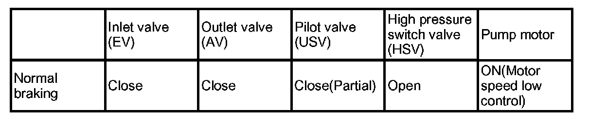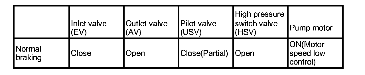 NOTE: EV: Inlet Valve AV: Outlet Valve LR: Rear left wheel RF: Front right wheel If: Front left wheel RR: Rear right wheel PE: Pump motor USV: Pilot Valve HSV: High pressure Switch Valve