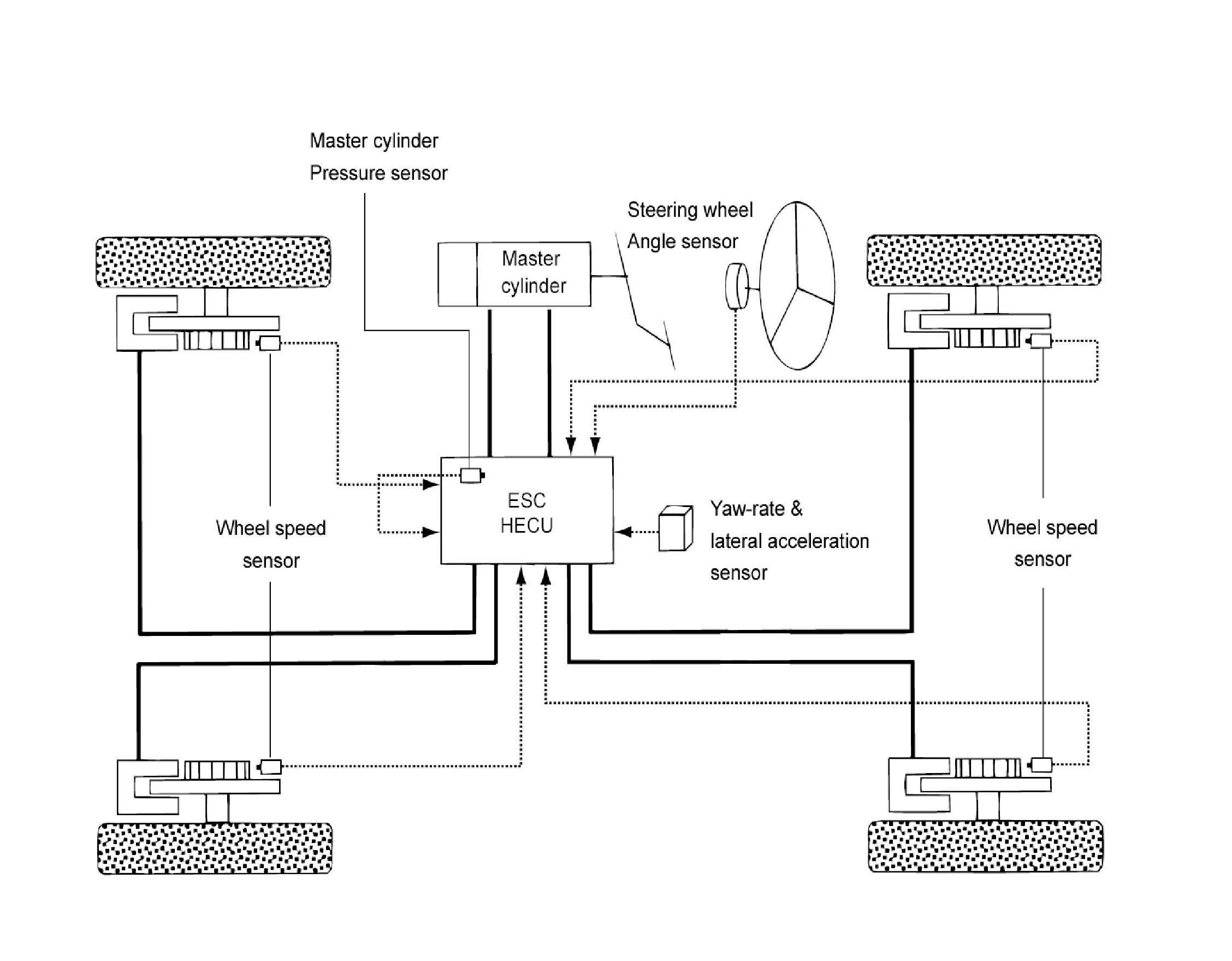 ESC system includes ABS/EBD, TCS and AYC function. ABS/EBD function the ECU changes the active sensor signal (current shift) coming from the four wheel sensors to the square wave. By using the input of above signals, the ECU calculates the vehicle speed and the acceleration & deceleration of the four wheels. And, the ECU judges whether the ABS/EBD should be actuated or not. TCS function prevents the wheel slip of drive direction by adding the brake pressure and engine torque reduction via CAN communication. TCS function uses the wheel speed sensor signal to determine the wheel slip as far as ABS function. AYC function prevents unstable maneuver of the vehicle. To determine the vehicle maneuver, AYC function uses the maneuver sensor signals (Yaw Rate Sensor, Lateral Acceleration Sensor, Steering Wheel Angle Sensor). If vehicle maneuver is unstable (Over Steer or Under Steer), AYC function applies the brake pressure on certain wheel, and sends engine torque reduction signal by CAN. After the key-on, the ECU continually diagnoses the system failure. (self-diagnosis) If the system failure is detected, the ECU informs driver of the system failure through the BRAKE/ABS/ESC warning lamp. (fail-safe warning)