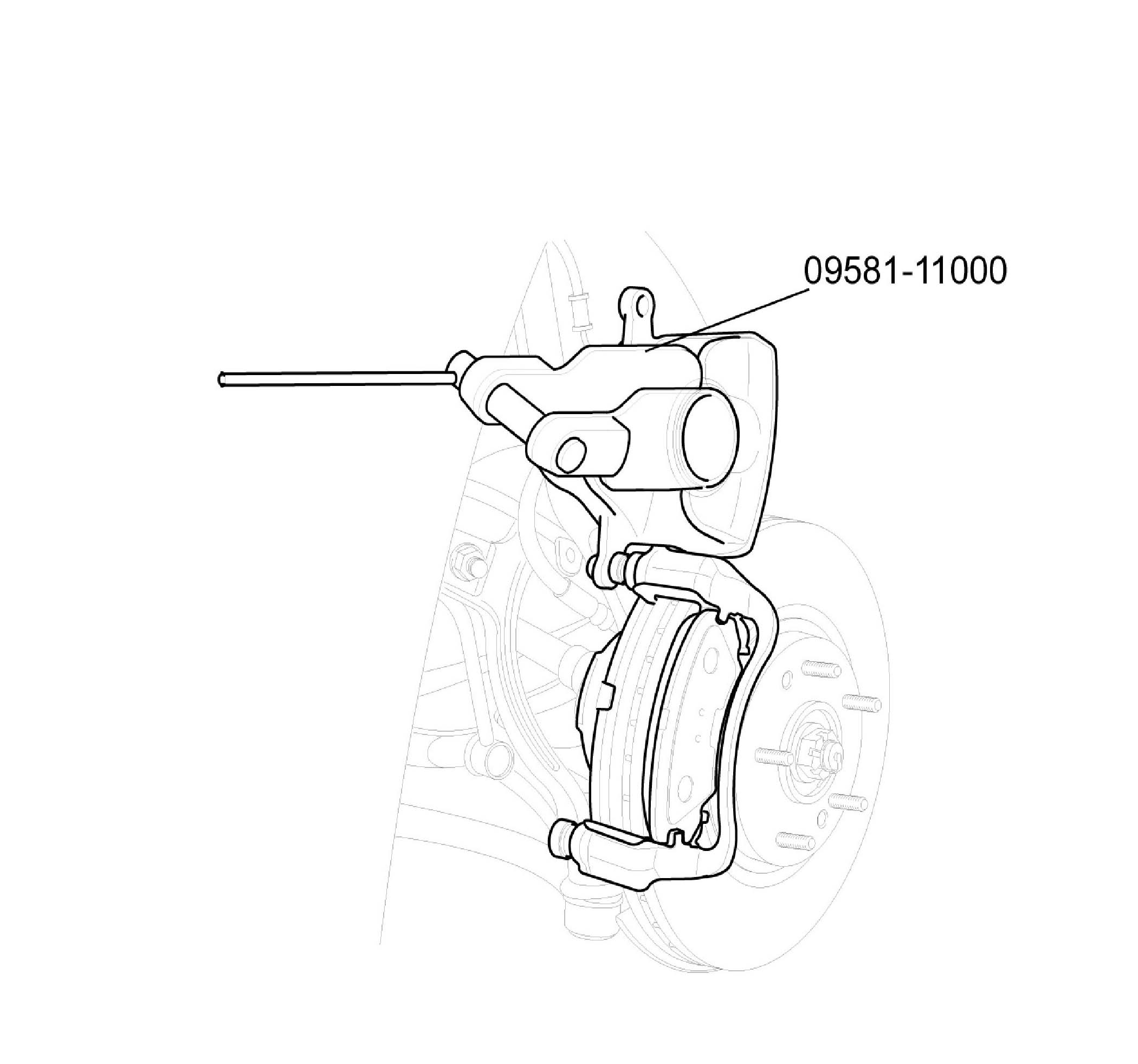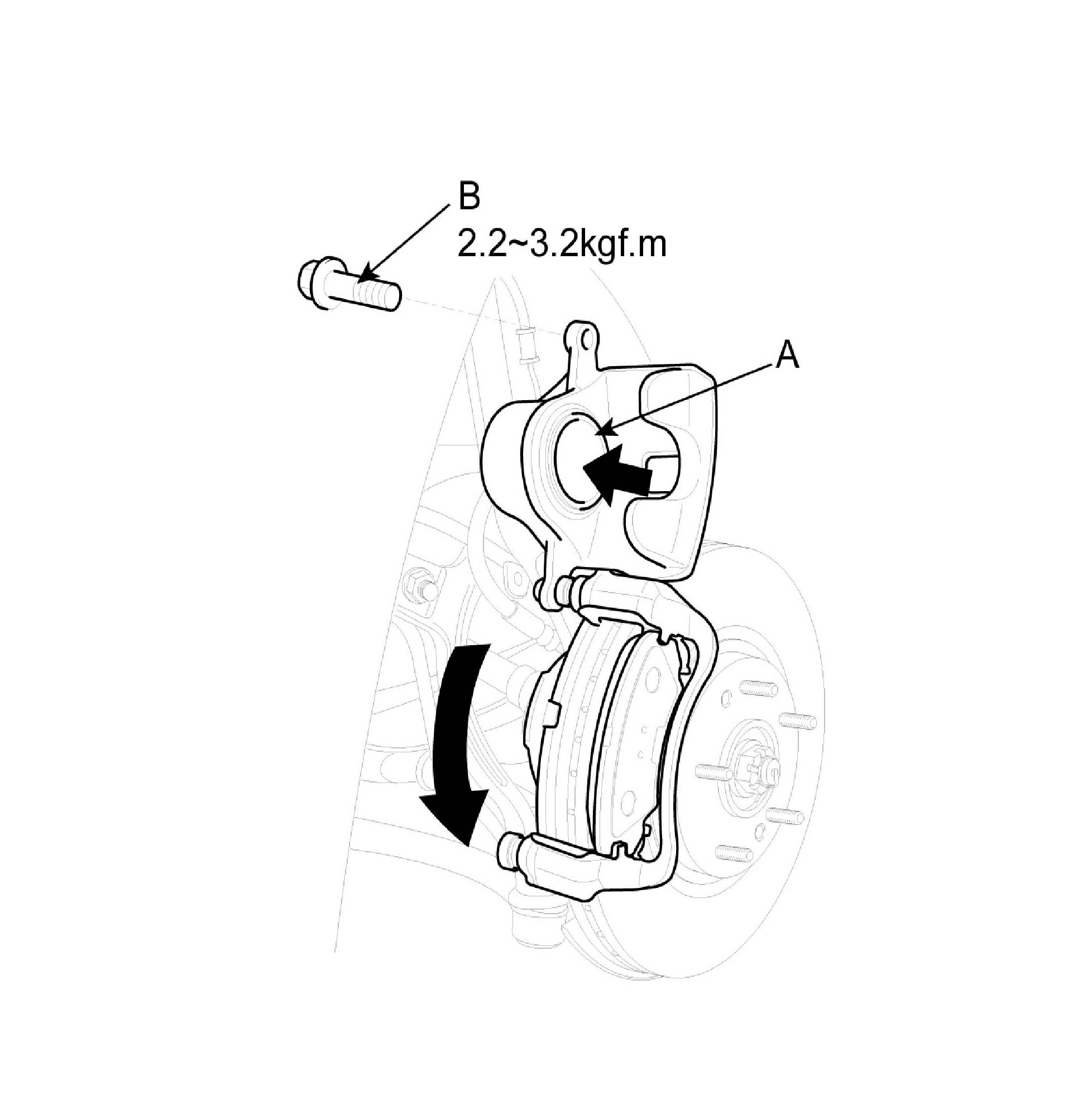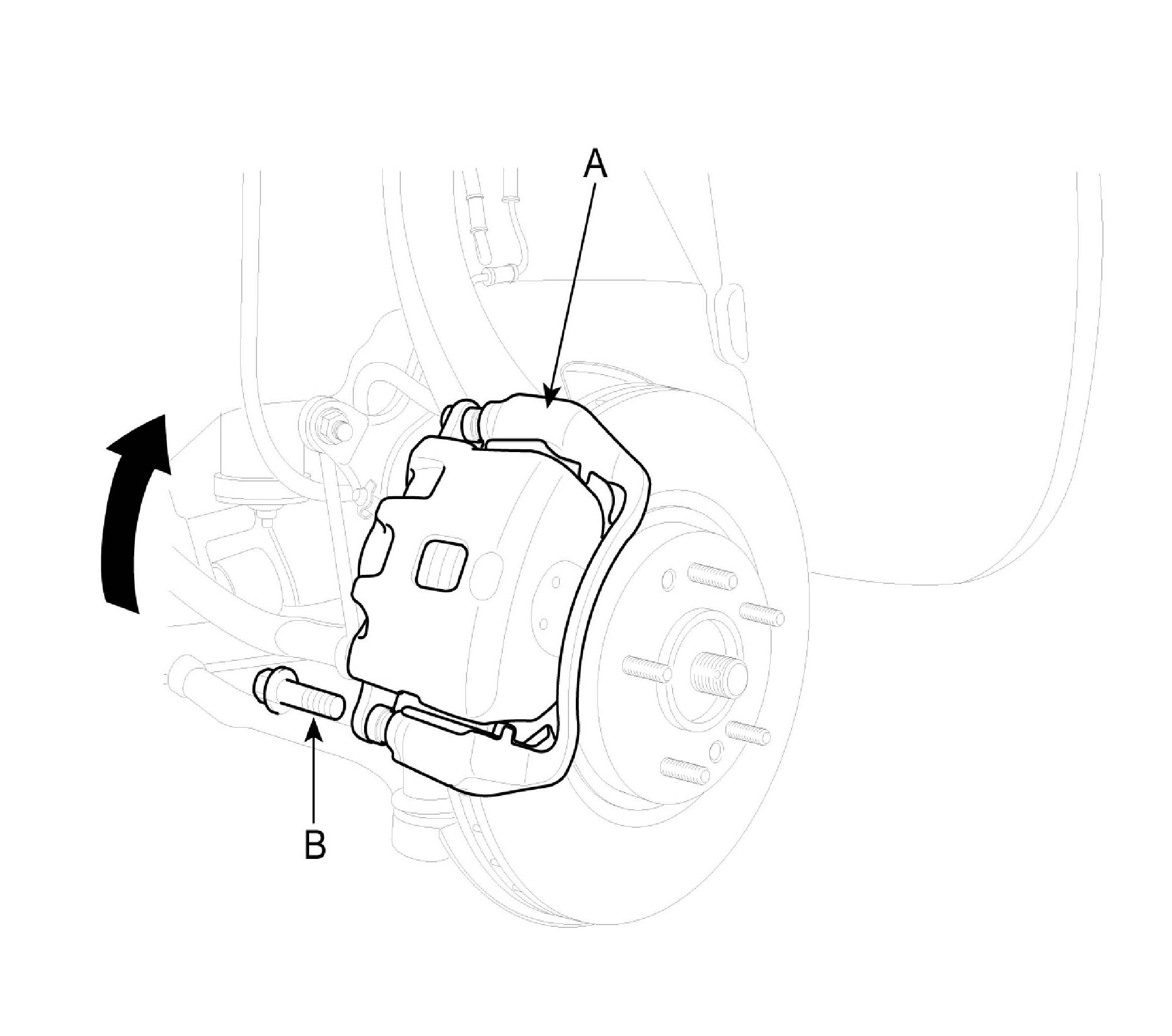 2. Remove the guide rod bolt (B), After raise the caliper assembly (A), support it with a wire.