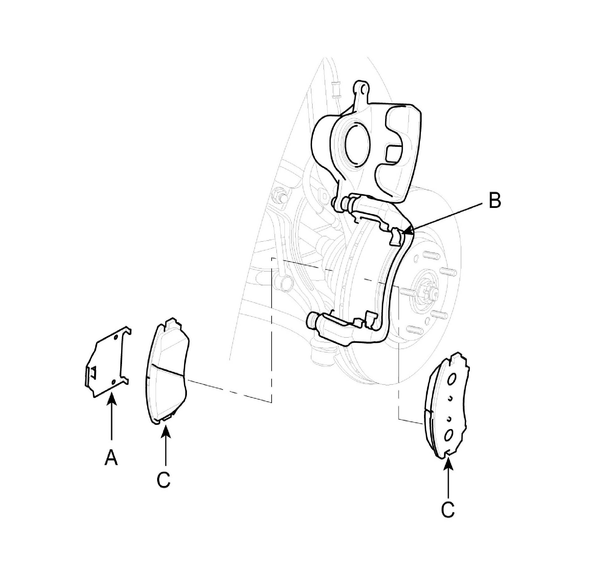 3. Remove pad shim (A), pad retainer (B) and pad assembly (C) in the caliper bracket.
