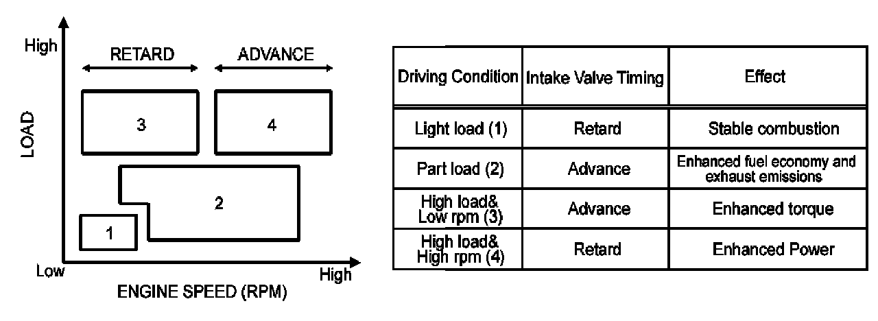 The CVVT system makes continuous intake valve timing changes based on operating conditions.Intake valve timing is optimized to allow the engine to produce maximum power.Cam angle is advanced to obtain the EGR effect and reduce pumping loss. The intake valve is closed quickly to reduce the entry of the air/fuel mixture into the intake port and improve the charging effect.Reduces the cam advance at idle, stabilizes combustion, and reduces engine speed.If a malfunction occurs, the CVVT system control is disabled and the valve timing fixed at the fully retarded position.