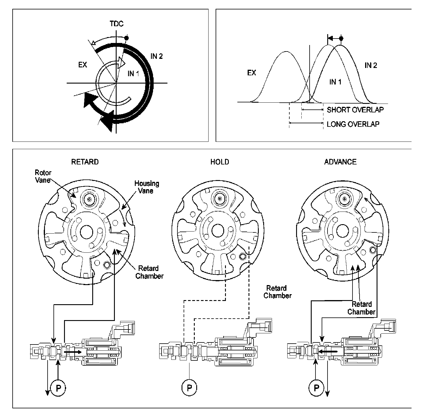 The OCV (Oil-flow Control Valve) spool lo cation at this time is as follows.Oil pump -> Advance oil chamber Little by little open the inflow side to the advance oil chamber) -> Almost close the drain side Be sure there might be a difference in the position according to the engine running state (rpm, oil temperature, and oil pressure).