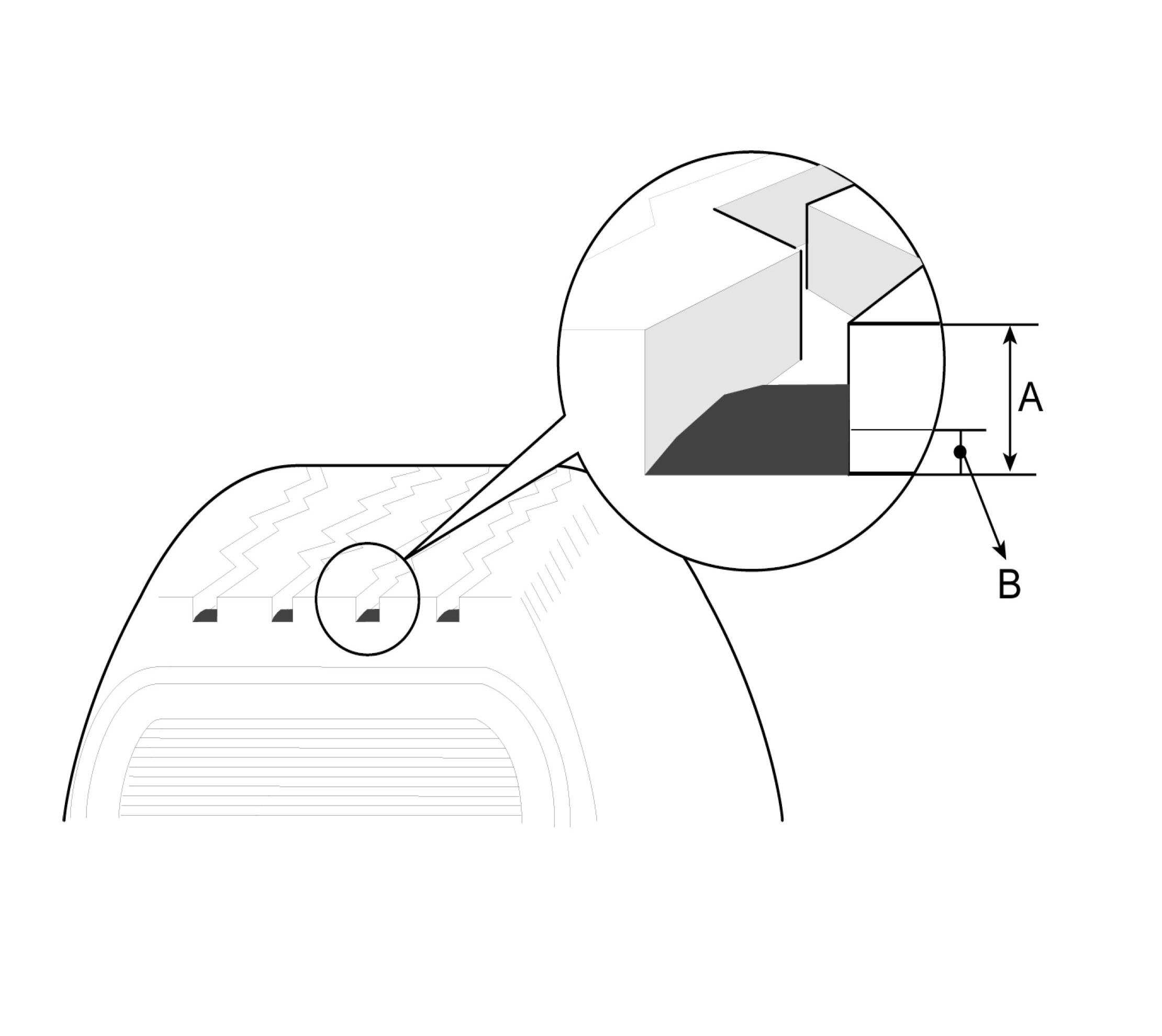 NOTE: When the tread depth of the tires is less than 1.6 mm (0.063 in), the wear indicators (B) will appear.