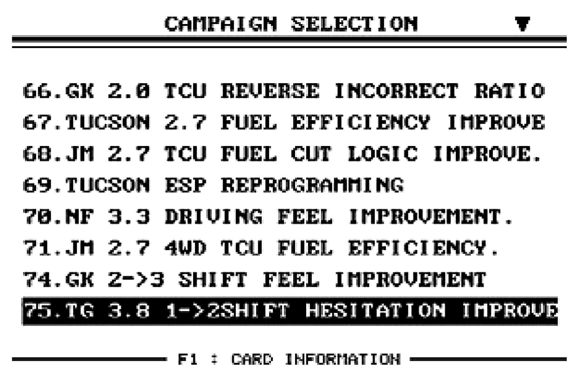 2. Select option "75. TG 3.8 1->2 SHIFT HESITATION IMPROVE" and press ENTER.