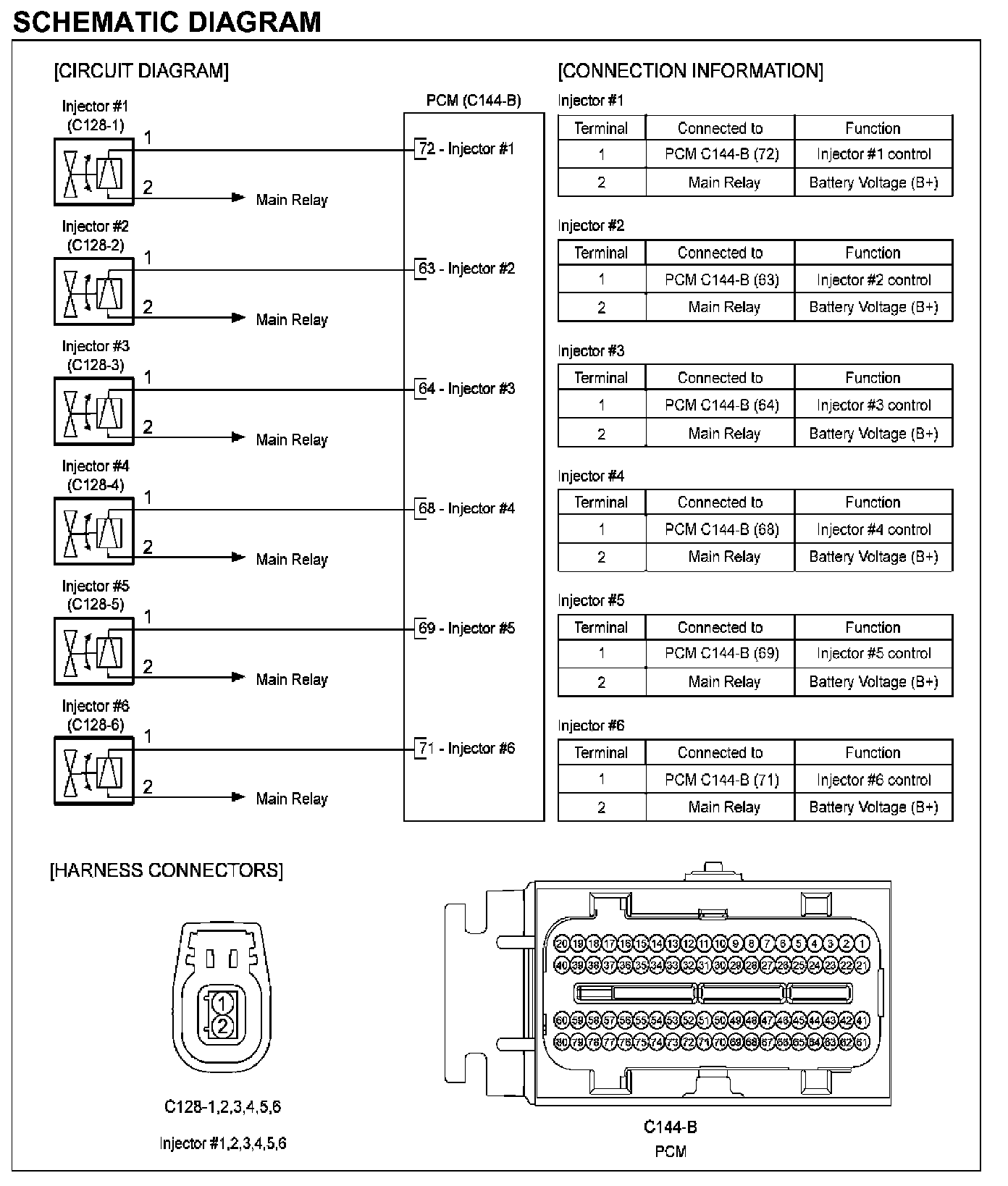 Based on information from various sensors, the PCM measures the fuel injection amount. The fuel injector is a solenoid-operated valve and the fuel injection amount is controlled by length of time that the fuel injector is held open. The PCM controls each injector by grounding the control circuit. When the PCM energizes the injector by grounding the control circuit, the circuit voltage should be low (theoretically 0 V) and the fuel is injected. When the PCM de-energizes the injector by opening control circuit, the fuel injector is closed and circuit voltage should be peak for a moment.