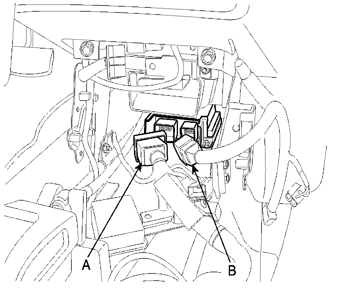 5. Disconnect the SRSCM harness connector(A) and (B) from the SRSCM.