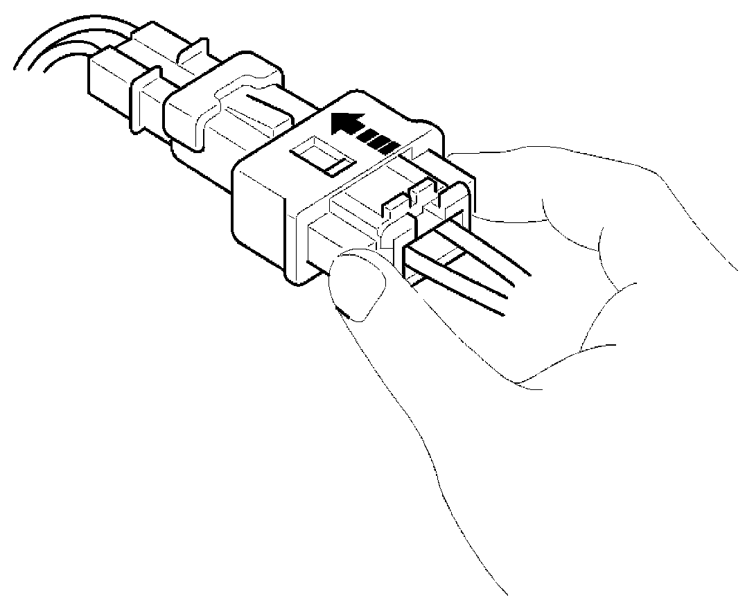 1. To reconnect, hold the pawl-side connector half, and press on the back of the sleeve-side connector half in the direction shown. As the two connector halves are pressed together, the sleeve (A) is pushed back by the pawl (C). Do not touch the sleeve.
