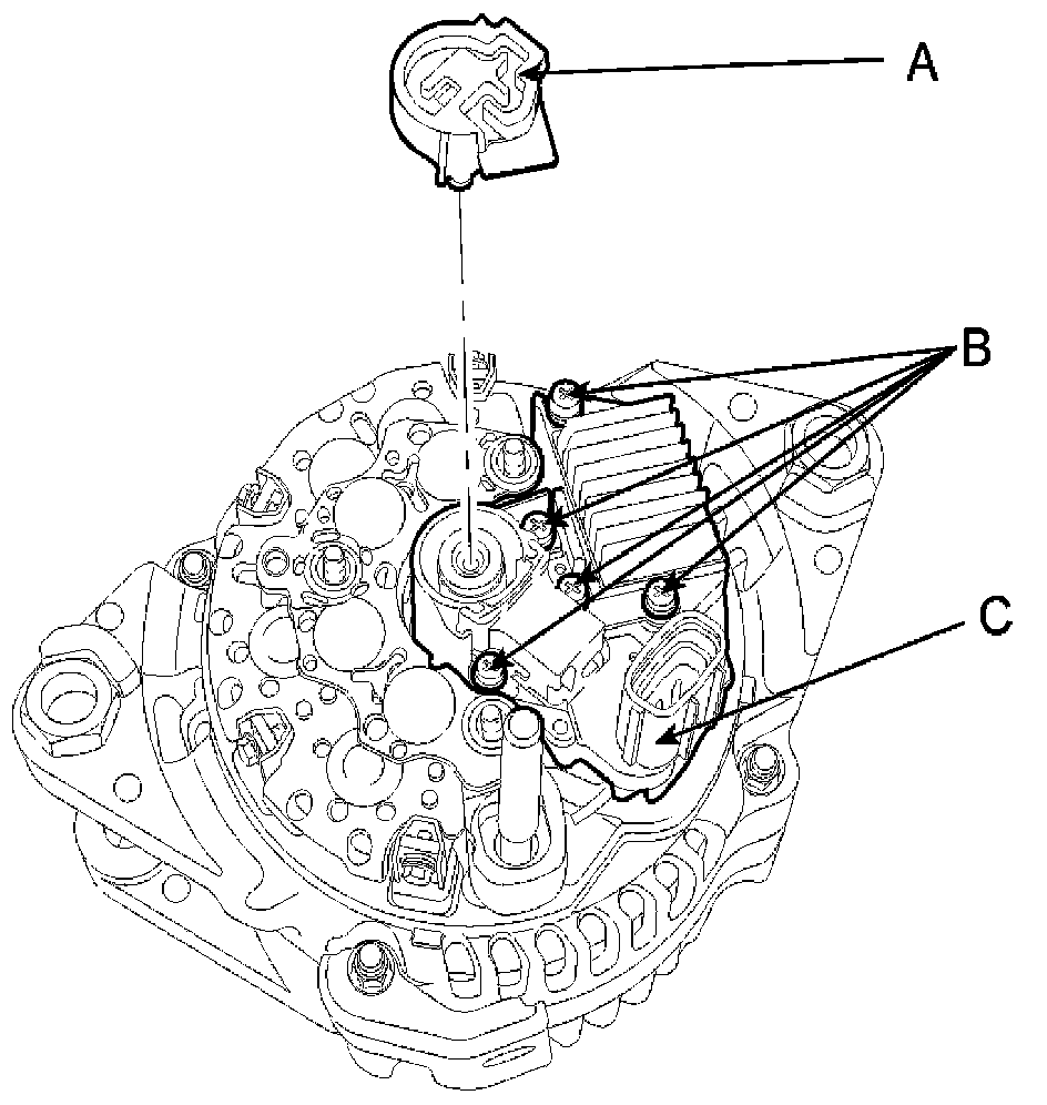 3. Loosen the mounting bolts (B) and disconnect the brush holder assembly (C).