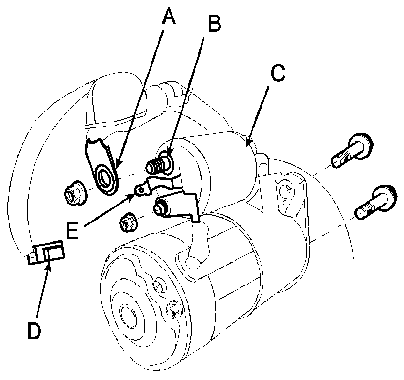 2. Disconnect the starter cable (A) from the B terminal (B) on the solenoid (C), then disconnect the connector (D) from the S terminal (E).