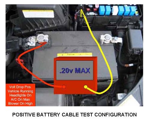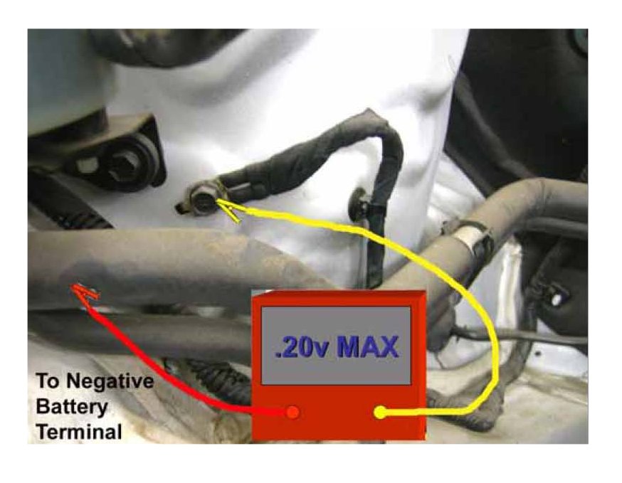 5. Perform voltage drop check to all Engine and Transmission ground straps. Check with the voltmeter positive lead on one end of the strap and the negative lead to the opposite end. If the voltage drop is more than 0.2 volts, repair or replace the ground terminal and/or ground strap.
