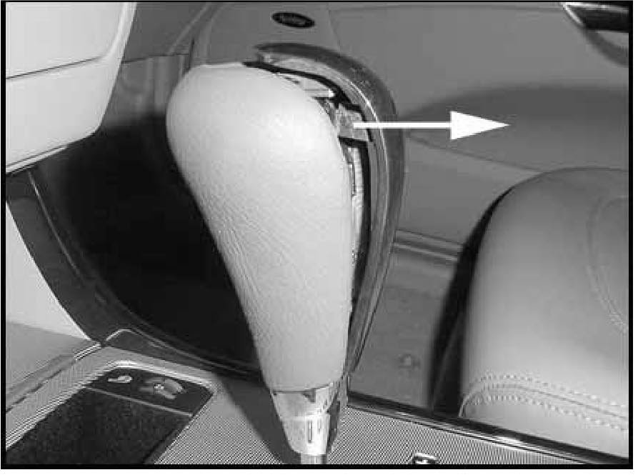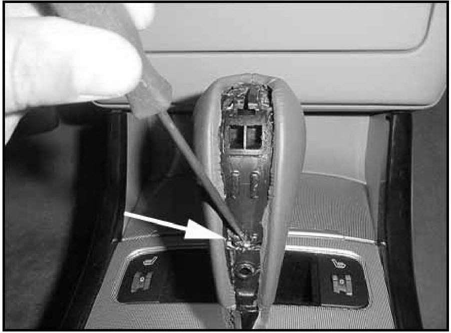 1. Remove the shift knob's plastic trim by prying at the indicated point to release the two lock tabs. Pull straight back to disengage the tabs.