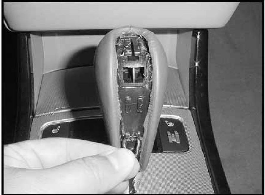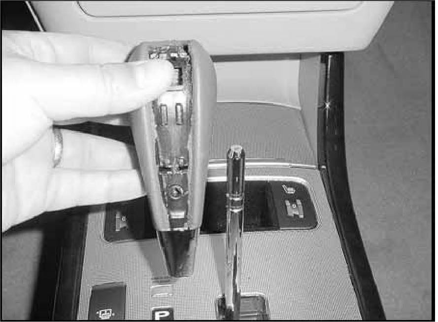 The shift knob lever removal procedure provided in the 2006 Azera Shop Manual is incorrect. In the shop manual, what appears to be a shift knob that is threaded onto the shift lever is actually held in place by a "C" - clip. Attempting to remove the shift knob by twisting the knob counter-clockwise to unthread it may result in damage to the shift knob. The correct removal procedure is provided in this bulletin.