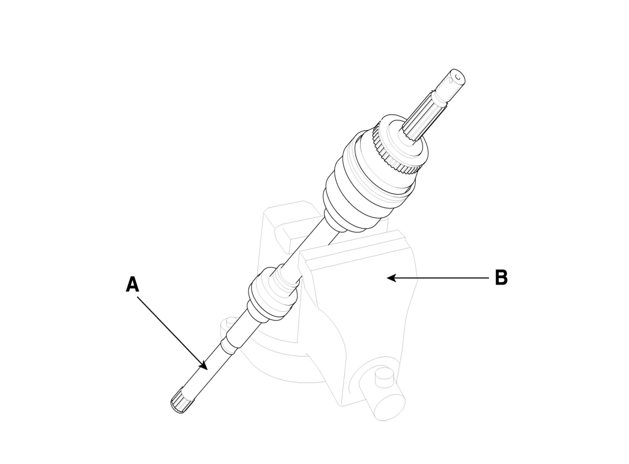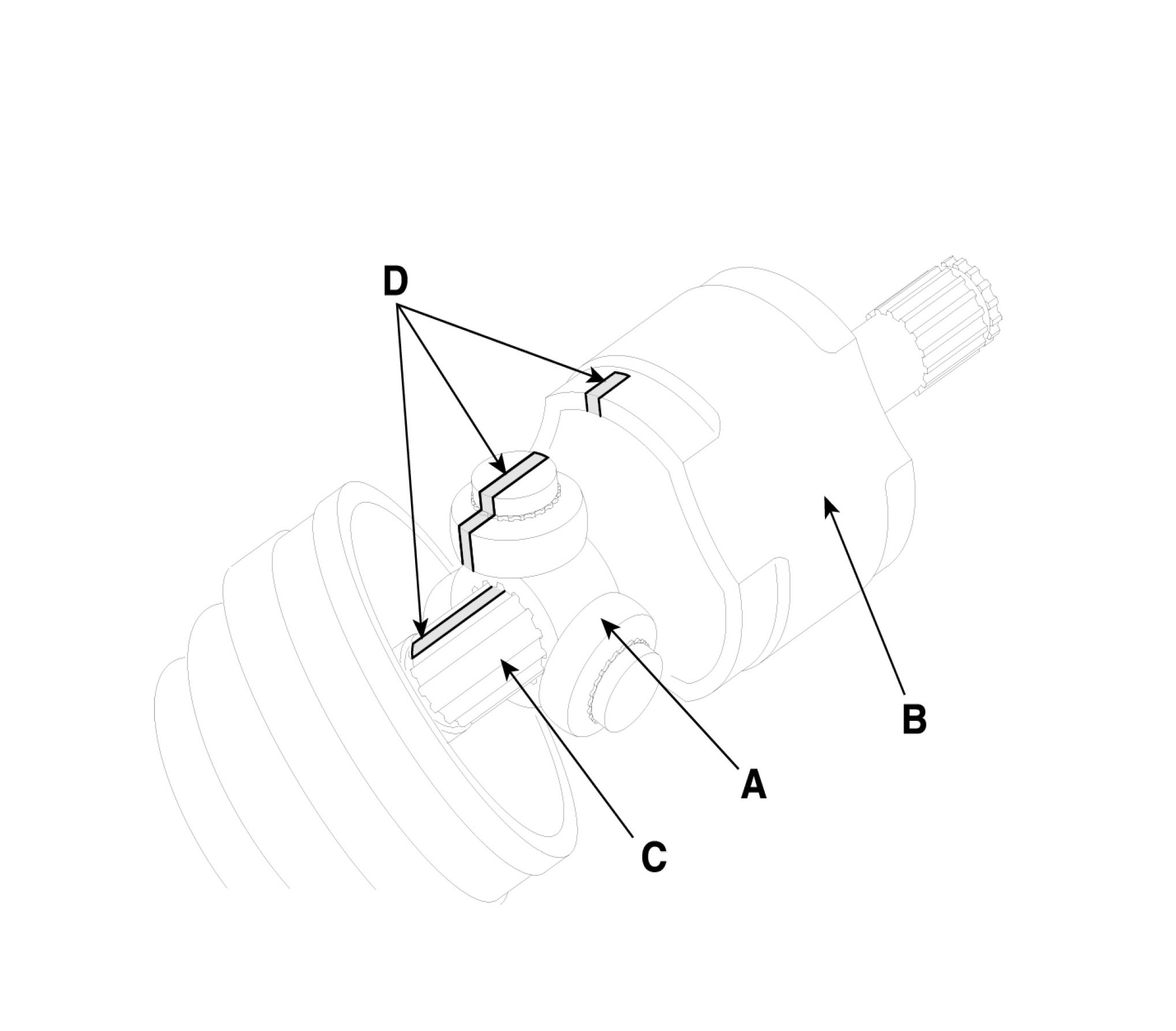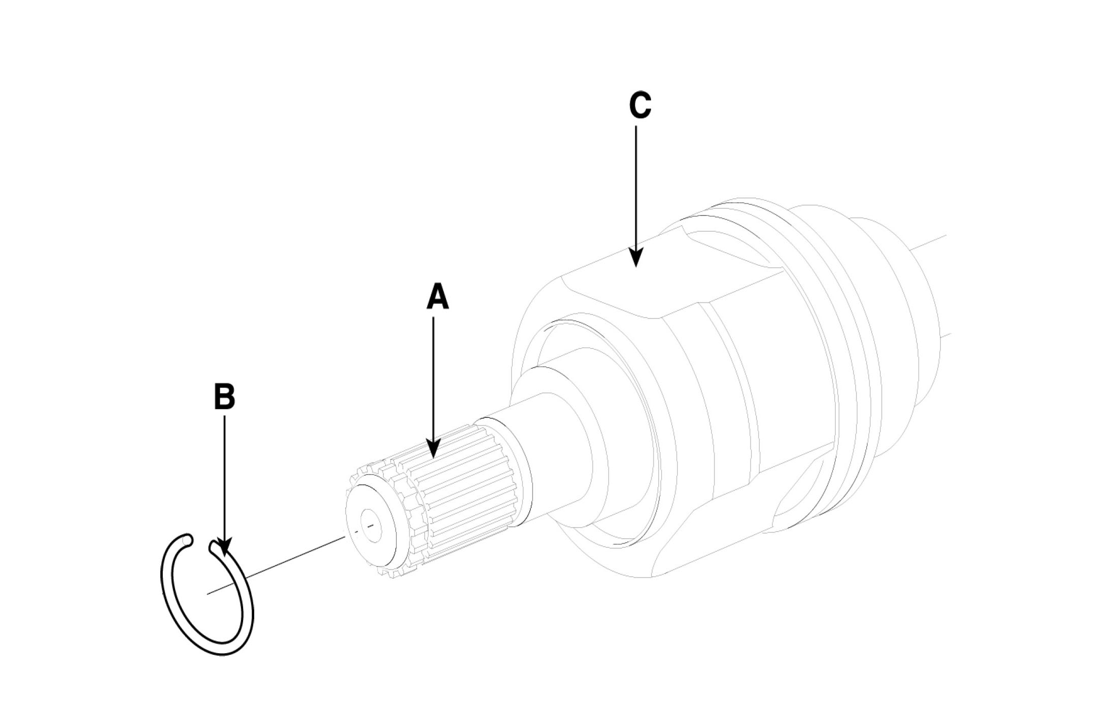 ^ Make alignment marks on spider roller assembly (A), PTJ case (B), and shaft splines (C) to aid reassembly.