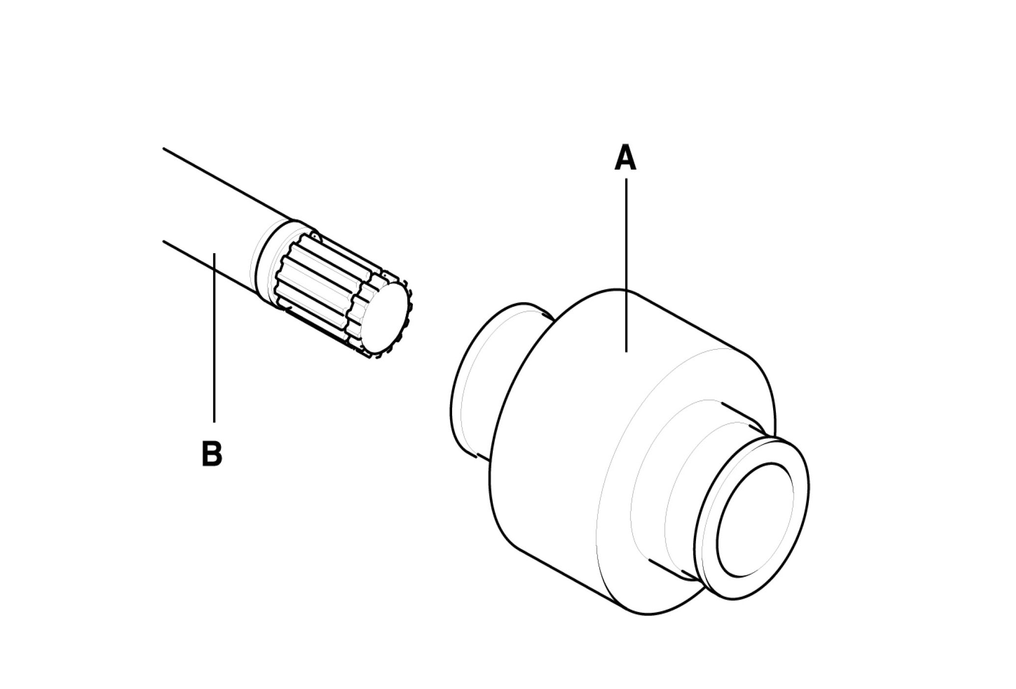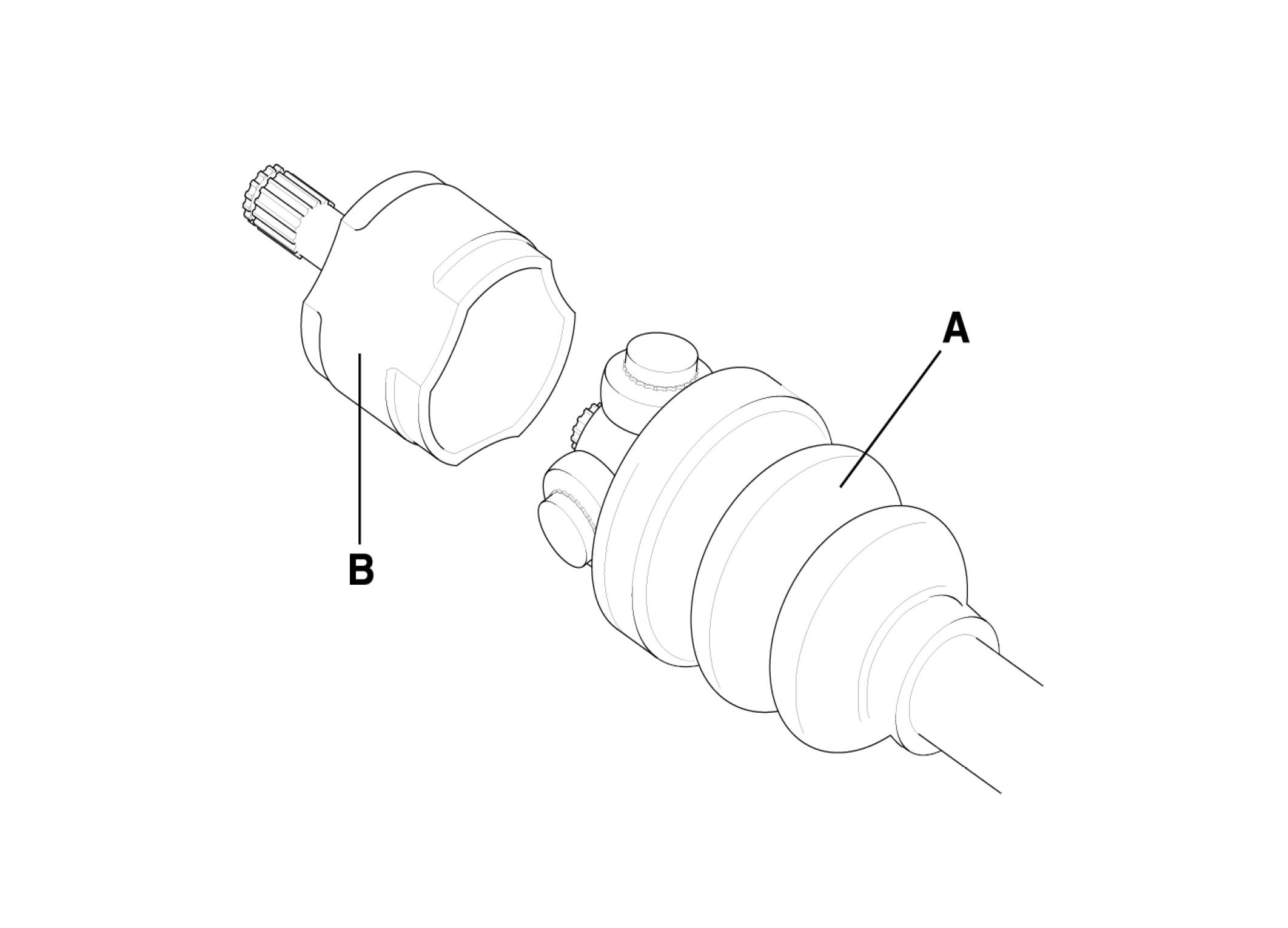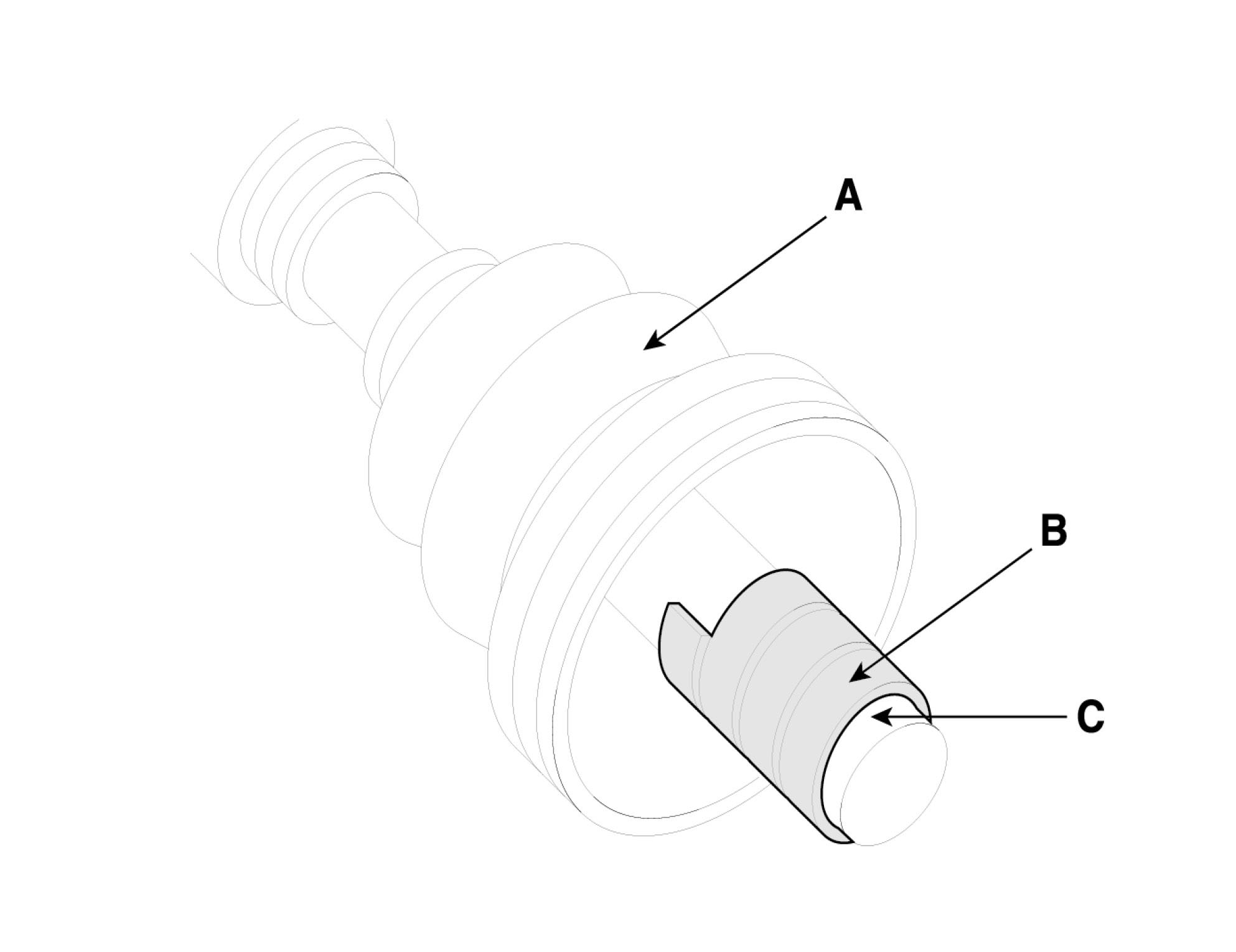 ^ Make alignment marks on spider roller assembly (A), PTJ case (B), and shaft splines (C) to aid reassembly.