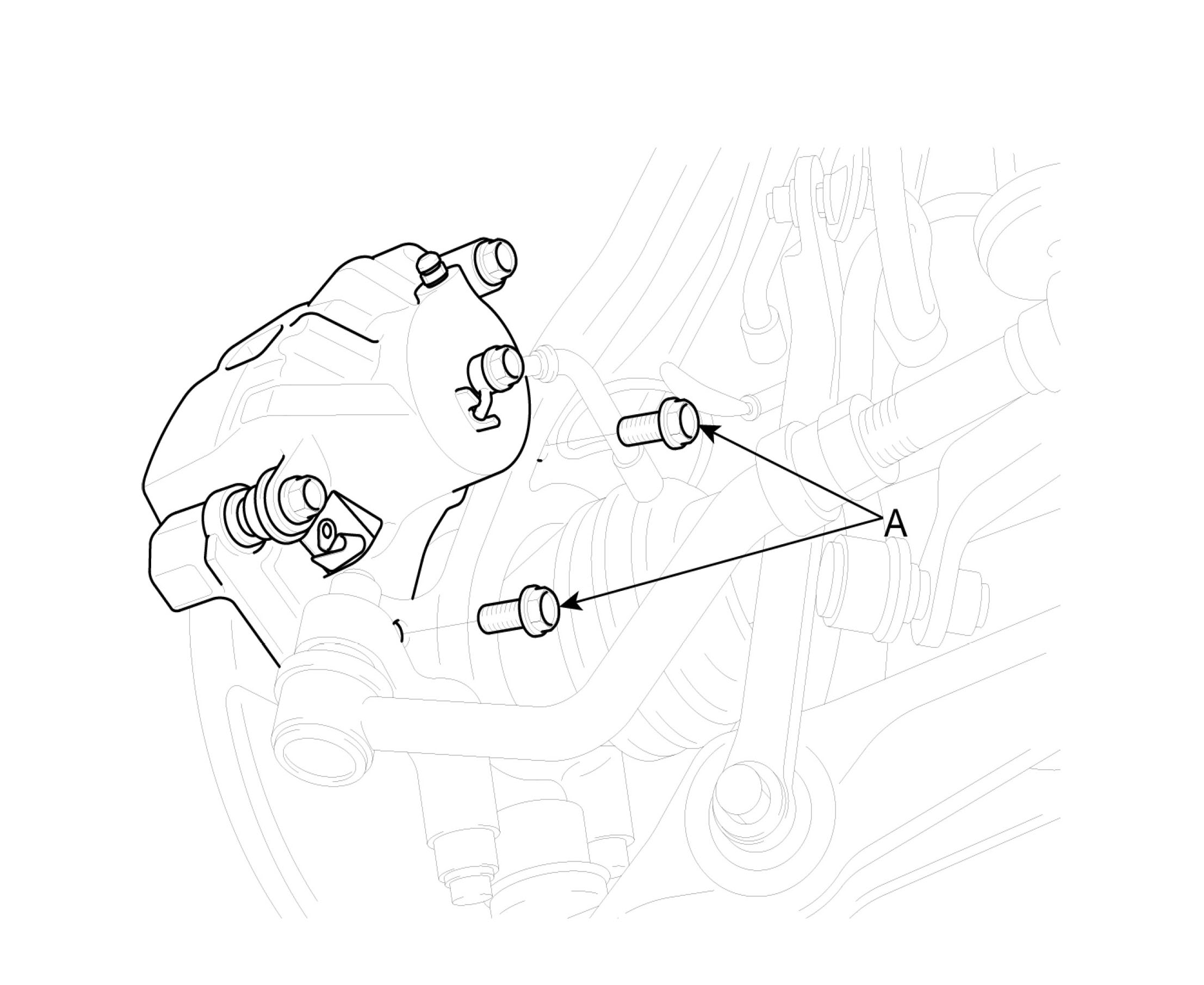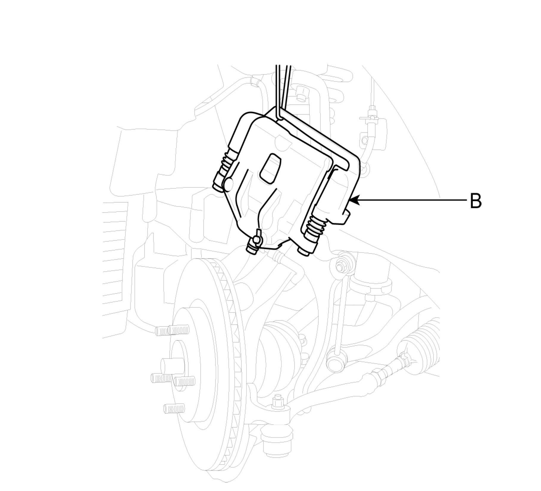 4. After loosening the bolts (A), remove the caliper assembly (B) and suspend it with wire.