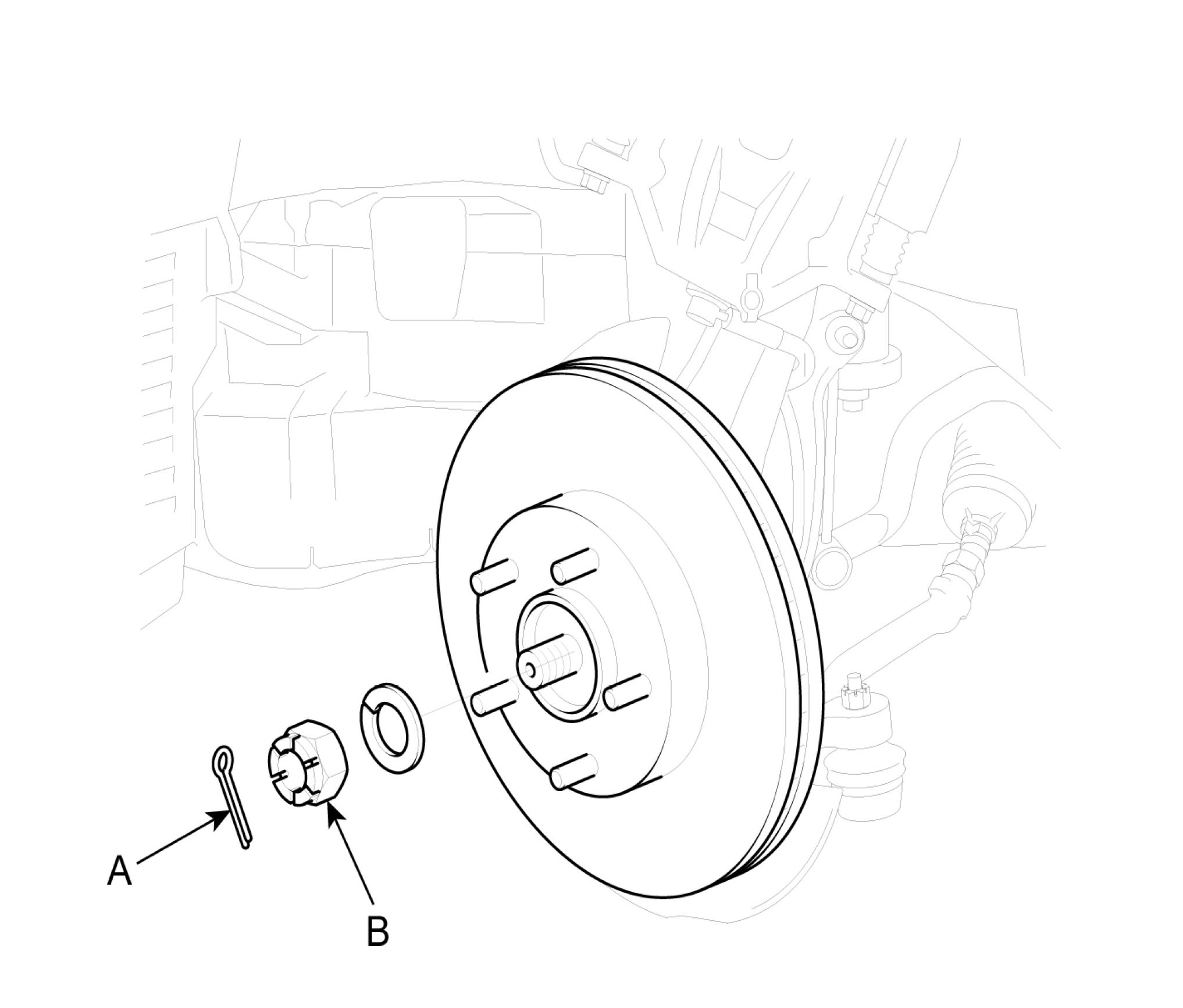 5. Remove the split pin (A) and driveshaft castle nut (B) from the front hub.