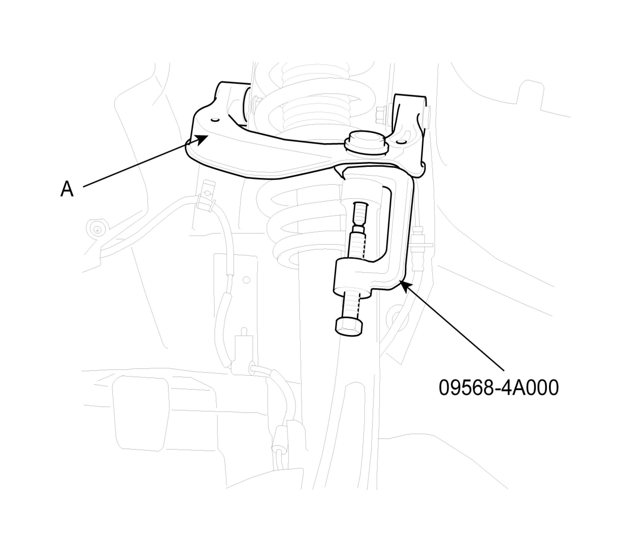 10. Using the special tool (09568-4A000), disconnect the knuckle from the upper arm assembly (A).