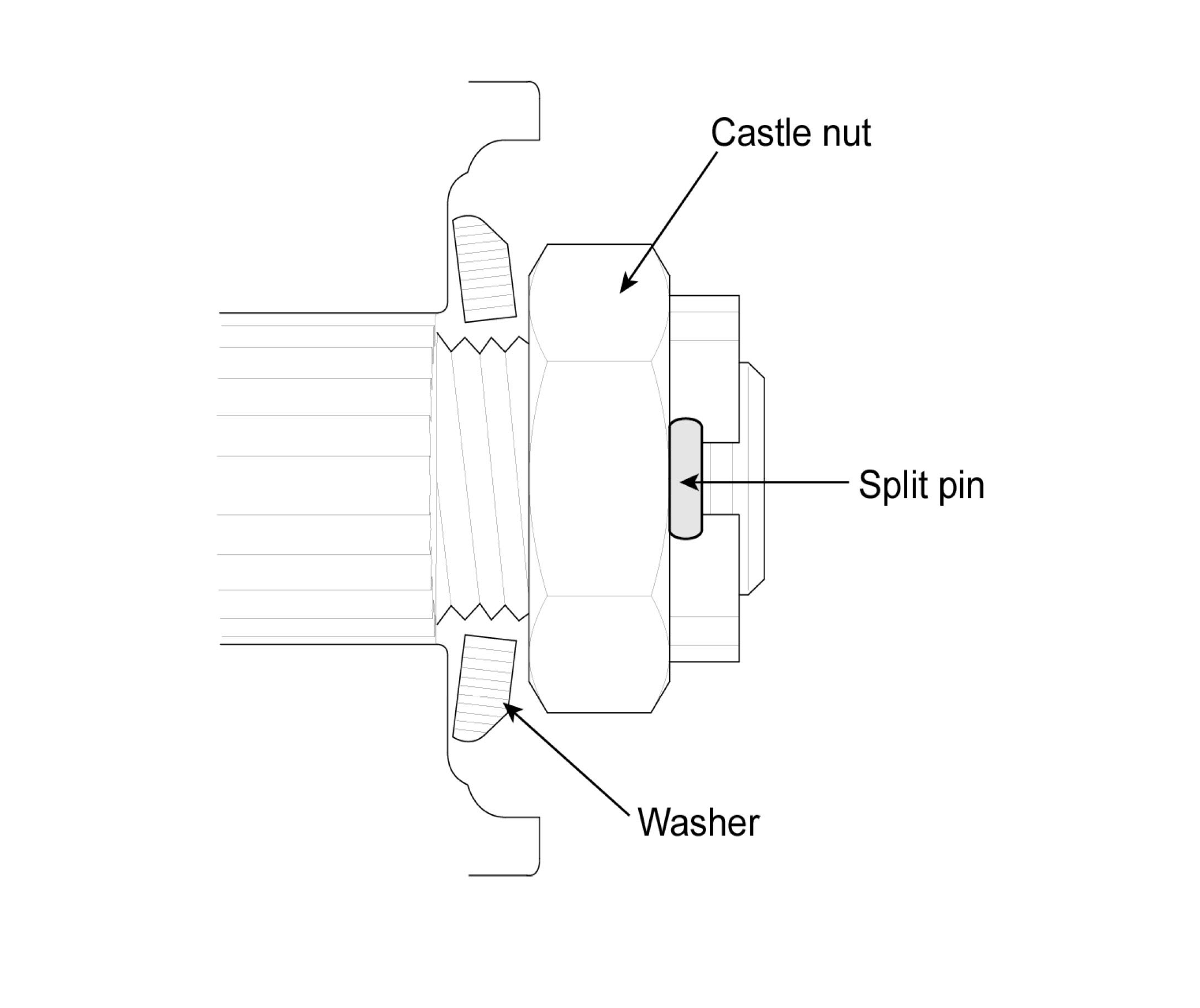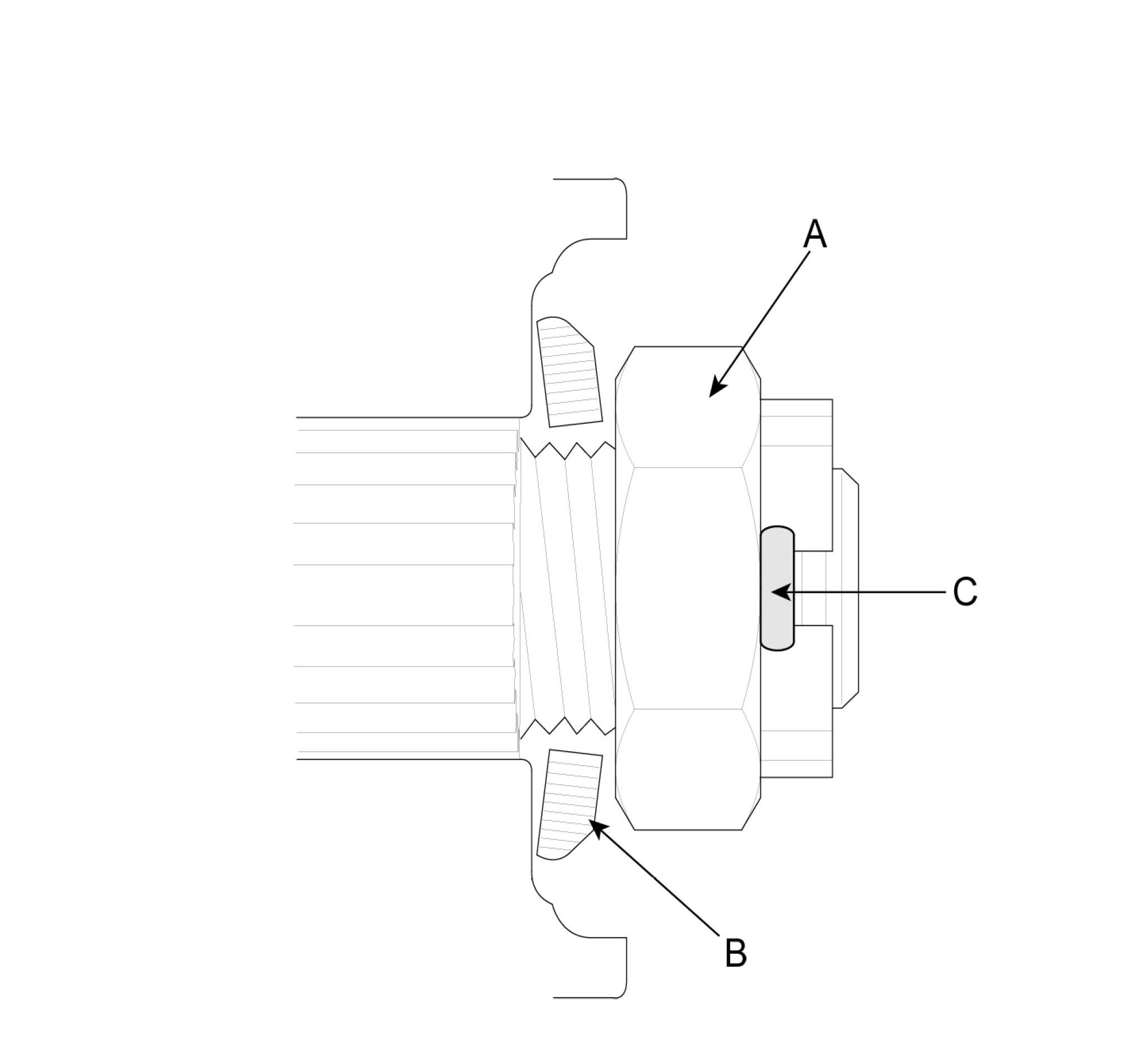 8. After installing the washer (B) with convex surface outward, install the lock nut (A) and the spilt pin (C).